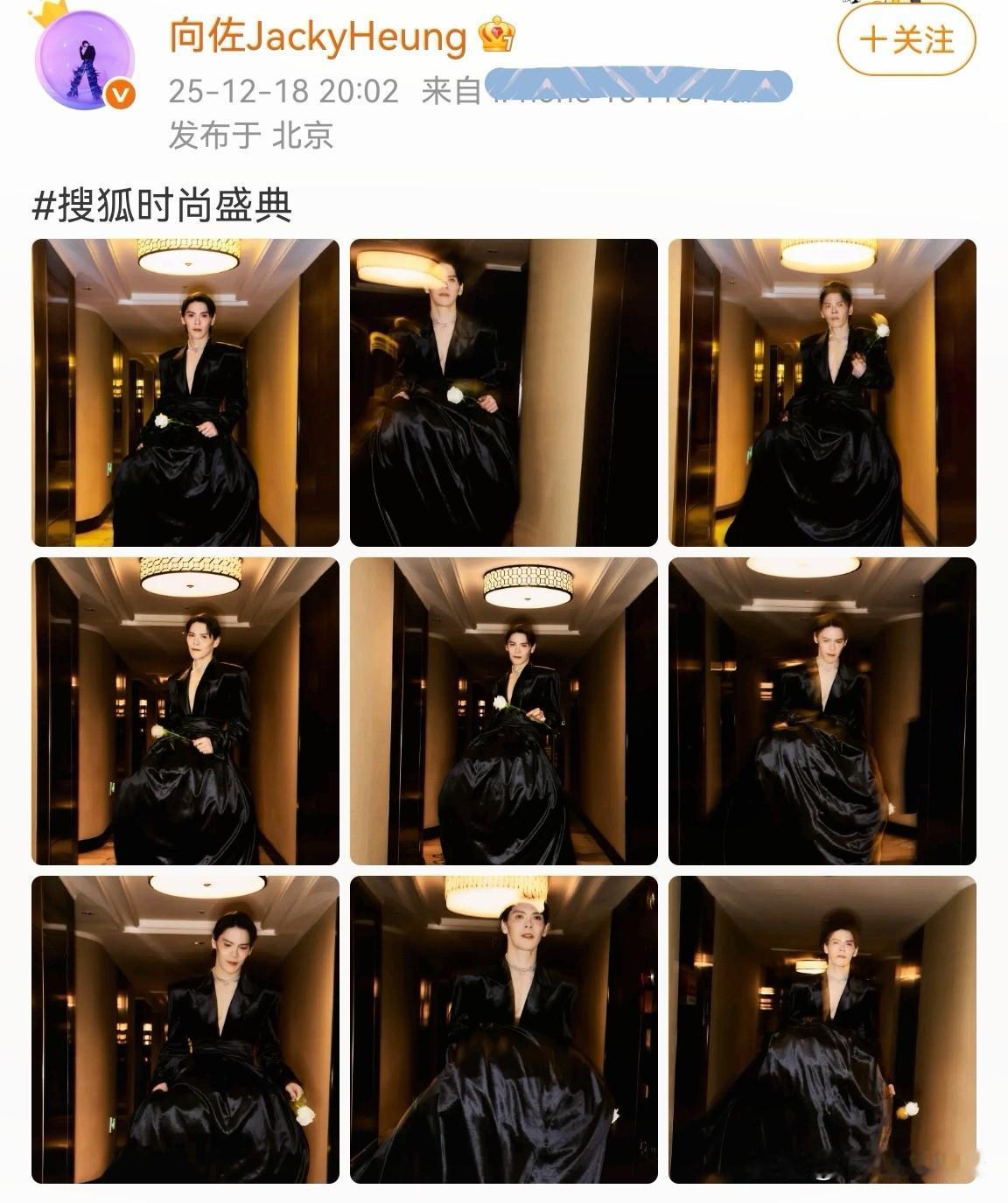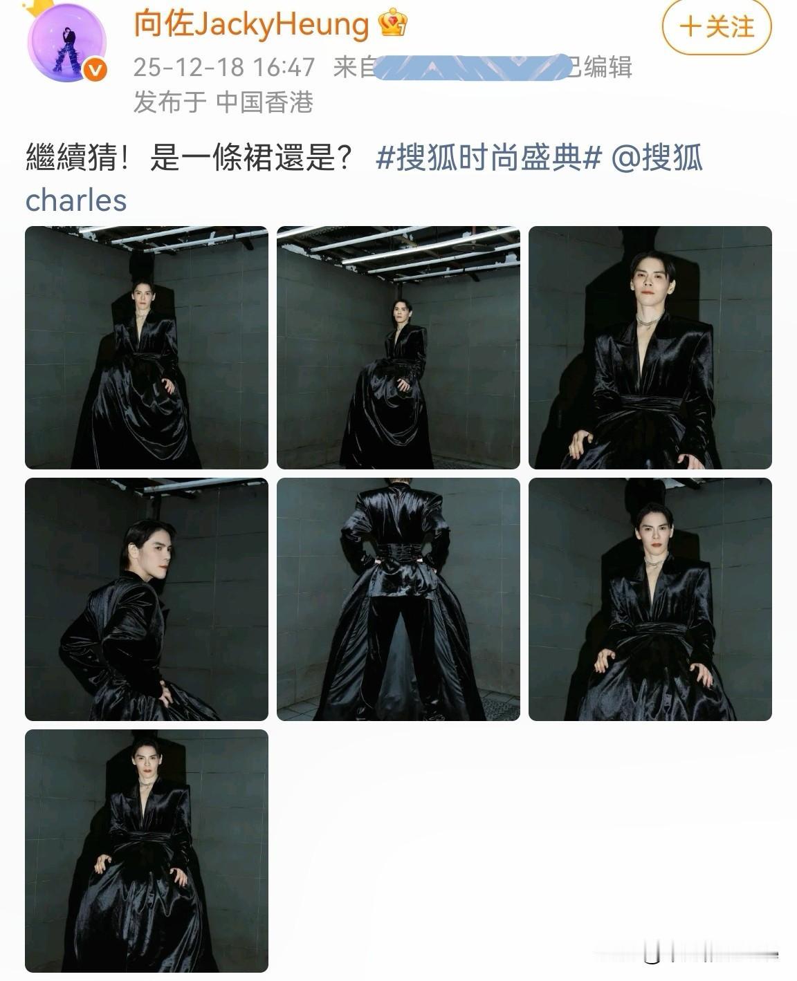 12月18日,向佐受邀参加搜狐时尚盛典,他的穿搭再一次惊艳到我了。他的整套着装正面看过去像裙子,背面看过去像裤子,我着实有点分不清楚,大家觉得呢?