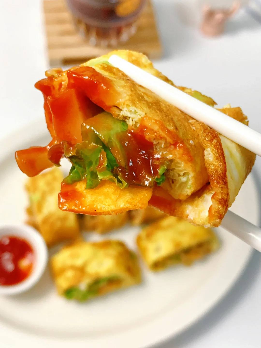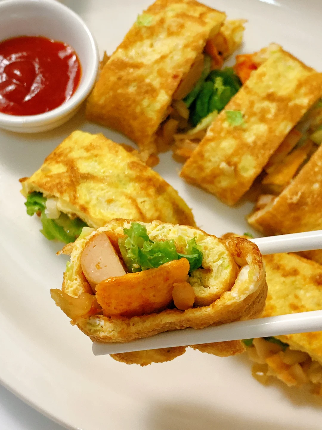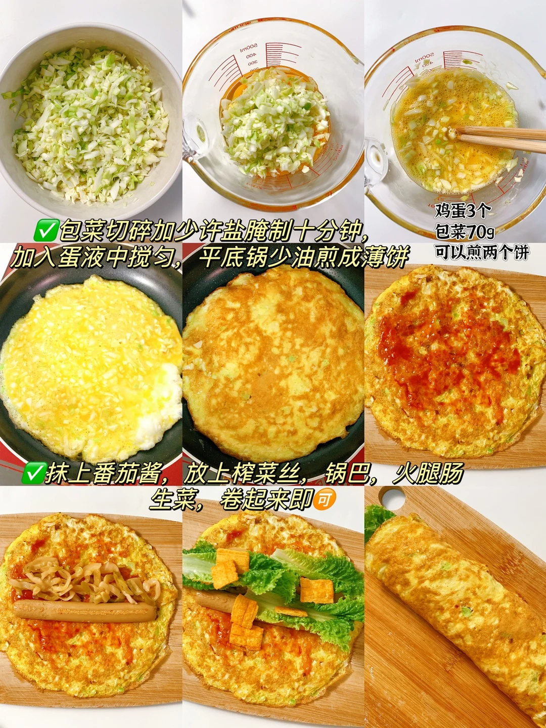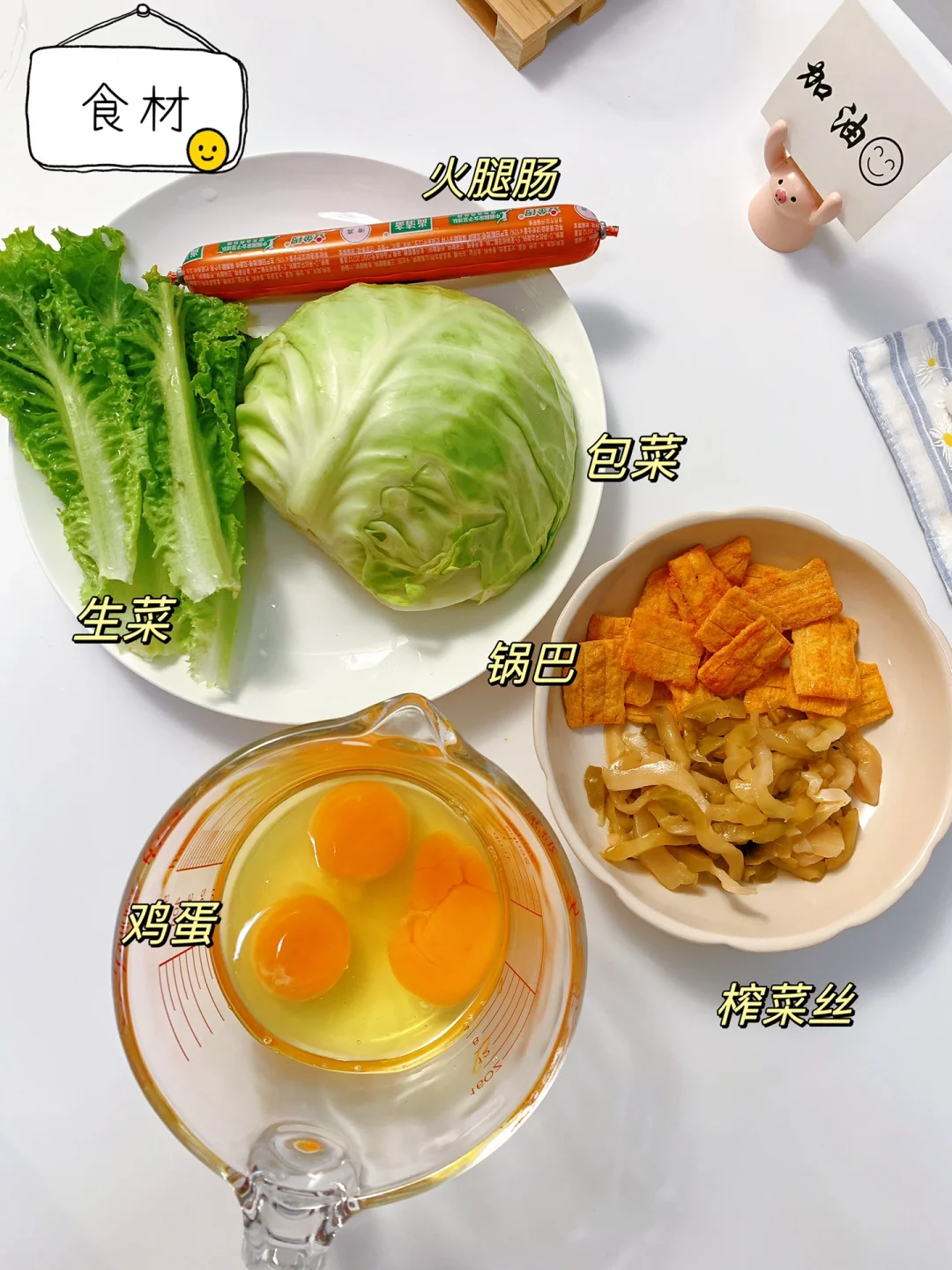 食材:包菜,鸡蛋,榨菜丝,火腿肠,生菜,锅巴(3个鸡蛋液➕70g包菜碎,可以煎两个饼)