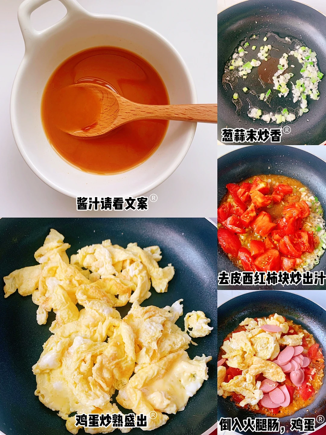 📝番茄去皮切小块,鸡蛋打散,火腿肠切片