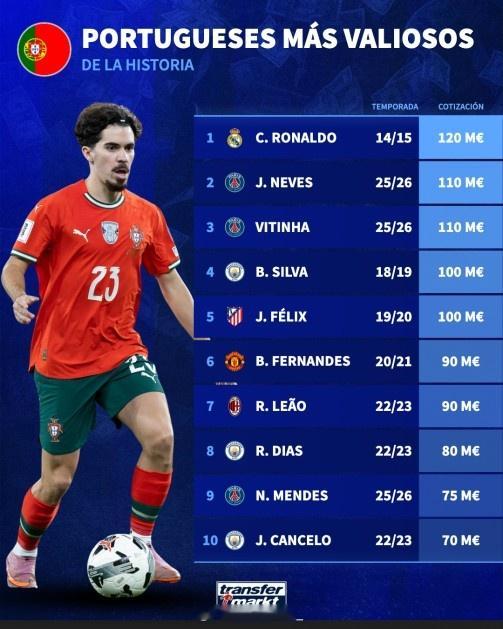 葡萄牙历史上身价最高的球员排名与数据:① C罗 - 1.2亿欧元(2014/15赛季)② 若昂·内维斯 - 1.1亿欧元(2025/26赛季)② 维蒂尼亚 - 1.1亿欧元(2025/26赛季)④ 贝尔纳多·席尔瓦 - 1亿欧元(2018/19赛季)④ 若昂·菲利克斯 - 1亿欧元(2019/20赛季)⑥ 布鲁诺·费尔南德斯 -9000万欧元(2020/21赛季)⑥ 拉斐尔·莱奥 -9000万欧元(2022/23赛季)⑧ 鲁本·迪亚斯 - 8000万欧元(2022/23赛季)⑨ 努诺·门德斯 - 7500万欧元(2025/26赛季)⑩ 坎塞洛 - 7000万欧元(2022/23赛季)