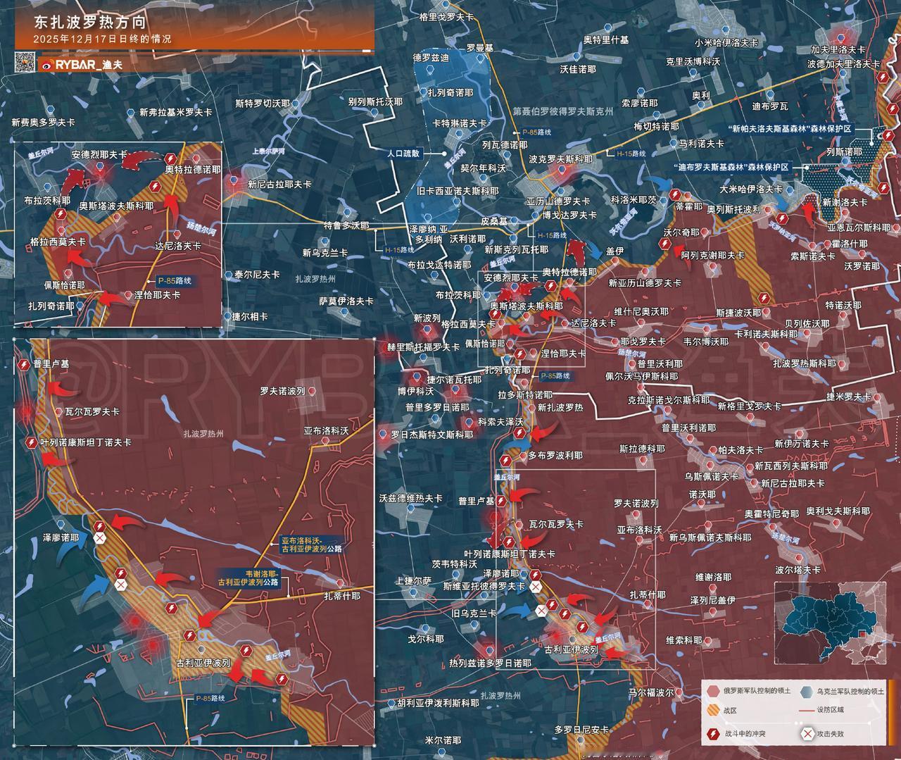🚩东扎波罗热方向 截至2025年12月17日日终的情况 乌军沿盖丘尔河建造的防线正在逐步瓦解。俄罗斯东部军区第36摩托化步兵旅的官兵已将敌军从格拉西莫夫卡地区逐出,从而扩大了在河流左岸的桥头堡阵地。 🔸乌军第110独立机械化旅所属部队在试图恢复失守阵地未果后,向新波列—捷尔诺瓦托耶防线方向后撤。值得注意的是,敌方的"消防队"——第225独立突击营,甚至未能来得及参与该村庄的战斗。 乌克兰指挥部定期将这支突击团调往战线不同的区域执行反击或"夺旗"任务。然而,即便是这样的步兵单位,其兵力也并非取之不竭。 🔸目前,俄军正在向位于战场北部的布拉茨科耶和安德烈耶夫卡方向发起进攻。该地段最激烈的战斗很可能将围绕两村之间的大型防御枢纽展开,控制此处将能确保俄军后勤补给路线的安全。 在另战场的一侧翼,俄军正在古利亚伊波列东部地区进行敌军清剿任务,并试图向市中心推进。乌克兰编队正动用前述的第225及第425突击团在其定居点北部实施反击。 📌 敌军力图重新控制P-85公路,以及近期被俄军解放的瓦尔瓦罗夫卡路段,乌军的目的是切断俄军进入古利亚伊波列的道路,并对在城东行动的俄军突击部队侧翼构成战略威胁。 俄乌冲突新局势俄军最新进展热点观点 来源:RYBAR_渔夫