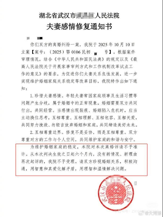 【#法院出具夫妻感情修复通知书劝合#】近日,一份由“武汉某区人民法院”出具的#夫妻感情修复通知书#在网上流传,引发广泛讨论。通知书中写道:为维护婚姻家庭的稳定,本院对本次离婚诉请不予准许。从本次判决生效之日起六个月内,没有新情况、新理由再次起诉的,我院不予受理。请双方珍视婚姻关系,积极沟通,用智慧和真爱化解矛盾,用理智和温情解决问题。记者梳理发现,法院向案件当事人出具“夫妻感情修复通知书”“离婚修复期通知书”并非个例。2019年,内蒙古苏尼特左旗人民法院就曾发出过首份《感情冷静修复期通知书》,明确给予当事双方两个月的冷静期,期间不得向对方提出离婚要求;2020年4月,四川南充市中级人民法院曾公布过阆中市人民法院出具的“离婚修复期通知书”,其中提到法院给予双方的离婚修复期限为六个月,修复期限内,原告不得向对方提出离婚;2022年5月,宁夏中卫市中级人民法院发文称海原县人民法院发出首份《情感修复期通知书》,称给予双方6个月的感情修复期。公开信息显示,此类通知书的依据多来自最高人民法院《关于开展家事审判方式和工作机制改革试点工作的意见》或《关于进一步深化家事审判方式和工作机制改革的意见(试行)》的要求。对此,表示,这类文书是法院在审理离婚诉讼案件过程中,以司法建议或通知形式发出的法律文件,其核心性质是 “法院的自由裁量举措”,而非法定必经程序。它通常出现在法官经审理后,认为夫妻双方不存在法定应当准予离婚的情形(如家暴、重婚等),且矛盾多源于生活琐事、一时冲动,婚姻仍有修复可能的案件中。6个月的禁诉期是根据我国民事诉讼法的规定,是对当事人诉权的一种程序性限制。而通知书中关于“珍惜夫妻感情”“互相尊重边界”等劝导性、说理性的内容,属于司法建议和引导,不具有强制执行力。她表示,从婚姻自由的角度思考,考虑到情感劝导内容本身没有强制执行力,所以,如果当事人双方任何一方不愿意进行“情感修复”,修复期都应当中止或不考虑修复,但二次起诉还是要遵循诉讼法的相关规定。当然,如果在修复期内发生严重损害夫妻感情或人身安全的事件,修复期也应当中止,如一方实施家庭暴力、虐待家庭成员等。(大河报)