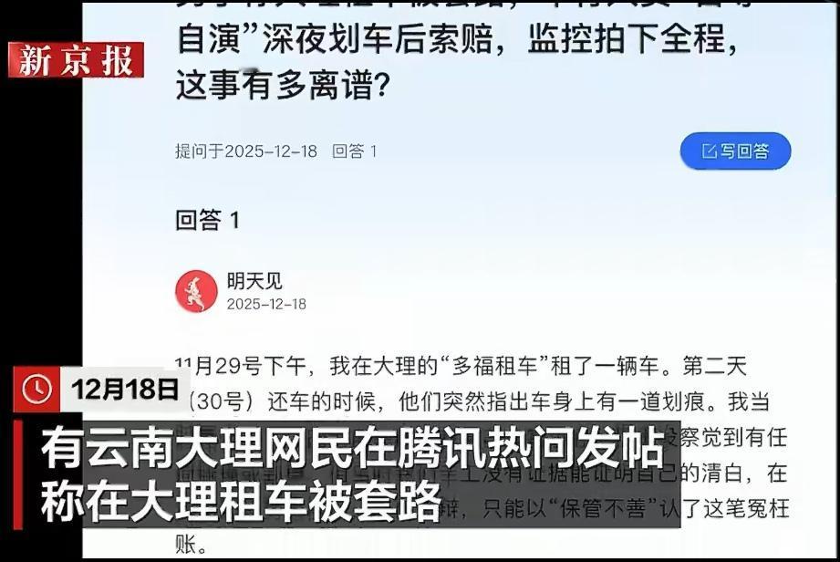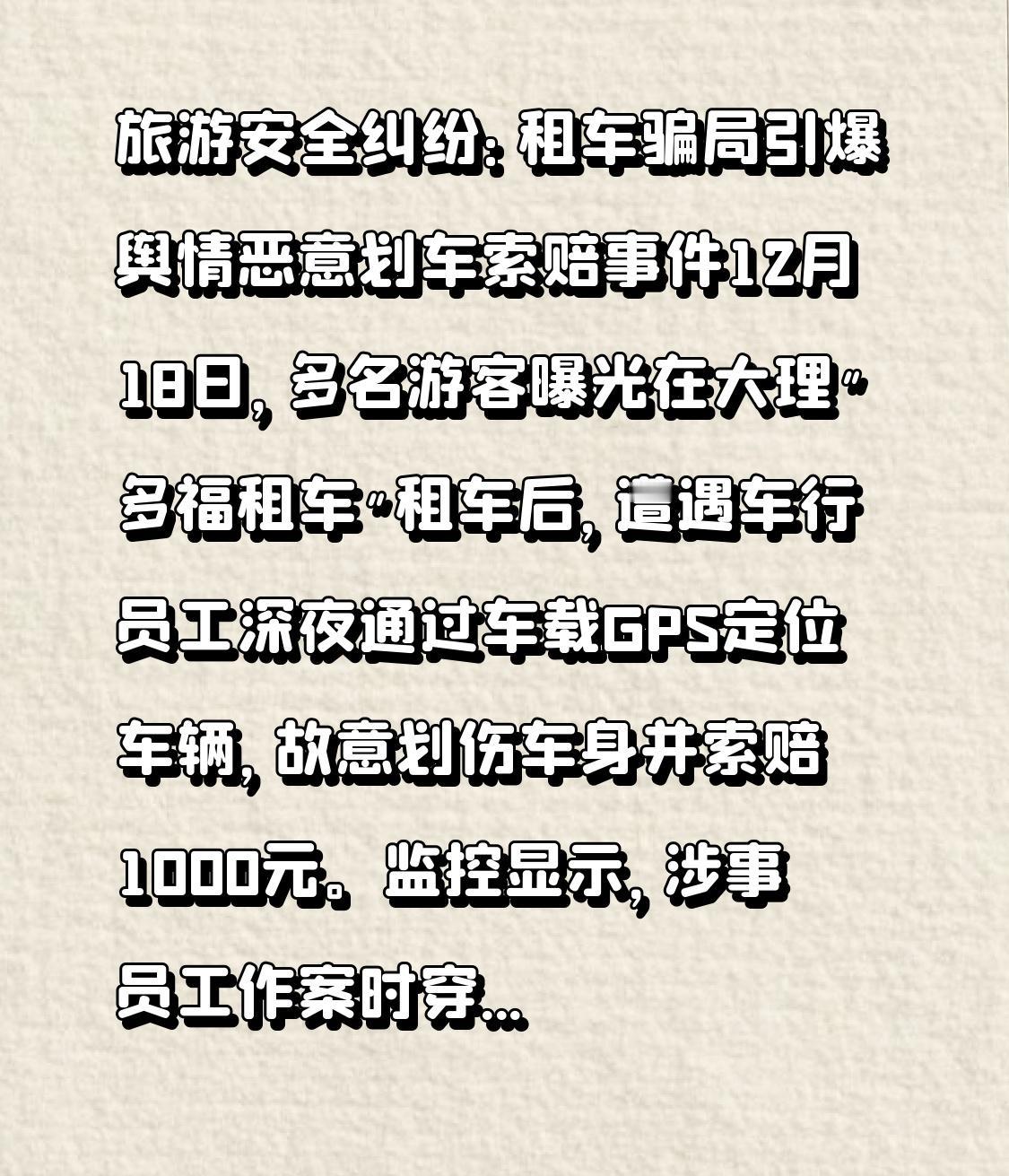 旅游安全纠纷:租车骗局引发舆论热潮 💎恶意划车索赔事件 12月18日,多位游客揭露在大理“多福租车”租车后,遭遇车行员工于深夜借助车载GPS定位车辆,蓄意划伤车身并索要1000元赔偿。监控画面显示,涉事员工作案时所穿衣物与次日验车时一致,警方已对其作出行政拘留12日、罚款800元的处罚。然而,车行负责人竟回应称“有代驾需求还会雇他,这很正常”,这引发了公众对大理旅游乱象的忧虑。 💎维权难点与行业警示 受害者表示,车行利用合同漏洞(如轮毂损伤不赔条款)以及游客“息事宁人”的心理实施诈骗,退款时还要求签署“不再追究责任”的协议。网友呼吁联合更多受害者进行举证,并建议租车时全程录像、选择正规平台。 后续影响与社会反思 🚘此事件在网络上持续发酵,大理旅游形象受到不小的冲击。许多计划前往大理旅游的潜在游客开始重新考量行程,甚至有人直接取消了租车游玩的打算。大理当地旅游部门也受到了舆论的压力,纷纷表示将加强对租车行业的监管力度,建立健全市场规范制度,防止类似事件再次发生。 🚕从社会层面来看,这起租车骗局暴露出旅游行业在快速发展过程中存在的监管漏洞和诚信缺失问题。旅游市场的繁荣不能以牺牲游客的权益为代价,相关部门需要在促进旅游发展的同时,加强对行业的监督管理,保障消费者的合法权益。 而对于游客自身而言,在享受旅游乐趣的同时,也应提高自我保护意识,仔细研读合同条款,遇到问题要勇敢维护自身权益,不能轻易妥协。希望通过此次事件,能给整个旅游行业敲响警钟,让旅游市场更加健康、有序地发展。