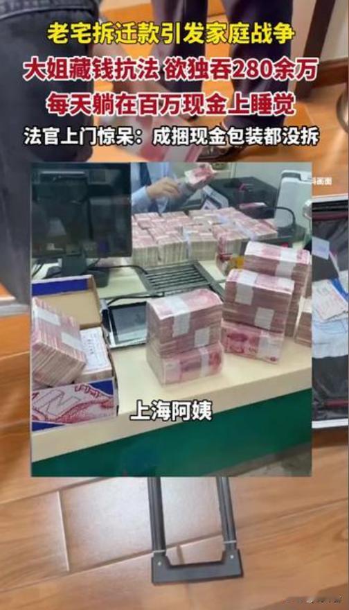 上海阿姨独吞280万拆迁款,竟每天躺百万现金上睡!结局反转太唏嘘 😱 电子支付时代,竟有人把百万现金藏床底,每天躺在上面睡觉?这离谱操作背后,是一场撕破脸皮的家庭战争,藏着6兄弟姐妹的血泪纠葛! 2019年,上海郑阿姨作为长女,因户口落在母亲老宅,竟独自领走280余万元拆迁补偿款💰。这笔本应属于全家的款项被独吞,老母亲心寒之下直接将她诉至法院。法院审理后认定,郑阿姨虽户口在册,但未实际居住且已享受过福利分房,判决她返还全款。 💔 亲情在利益面前不堪一击,郑阿姨的做法不仅伤了母亲的心,更让手足之情降到冰点。本以为判决生效就能平息纠纷,没想到反转接踵而至——母亲突然病逝,这笔钱成了6兄弟姐妹共有的遗产,郑阿姨却拒不履行判决,谎称钱已花光或理财亏损。 执行法官排查后断定钱款仍在家中,上门搜查时震惊全场:床底盒子、牛奶箱里藏着成捆现金,总计240余万元,部分仍原封未动!面对铁证,郑阿姨终于认错,声泪俱下求弟妹谅解,称自己曾多尽赡养义务。最终兄妹们心软,减免部分利息达成和解。 钱没了可以再赚,亲情散了难挽回。你觉得郑阿姨的忏悔值得原谅吗?如果是你,会为了利益放弃手足之情吗? 上海阿姨独吞6兄弟姐妹同属拆迁款 女子每天躺在100万元现金上睡觉 拆迁款引发的家庭纠纷