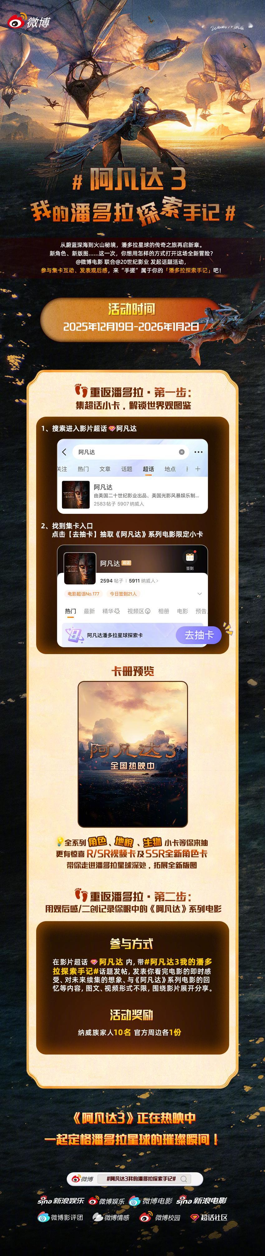 电影《阿凡达3》今日上映,潘多拉星球之旅再启新章。阿凡达3我的潘多拉探索手记活动已开启,即日起,前往阿凡达 点击“去抽卡”参与集卡,独家角色、生物、地貌小卡等你解锁;带话题在超话发表观后感、二创等内容,聊聊对系列电影的感受,还有机会赢得官方周边奖励🎁跨年电影愿