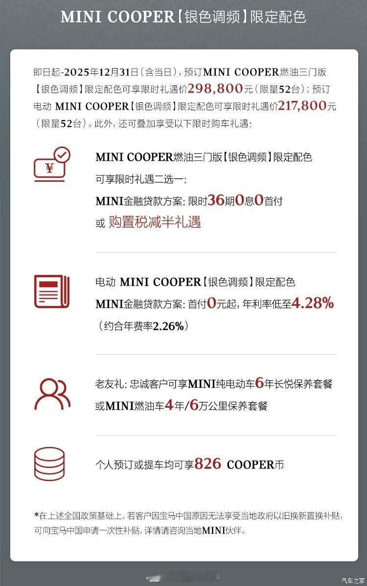 MINICOOPER银色调频限定版正式上市 据悉,12月19日,MINI COOPER银色调频限定版正式上市,其中电动MINI COOPER限时礼遇价21.78万起、MINI COOPER燃油三门版限时礼遇价28.88万起。两款车型均限量52台,12月31日前购车可享36期0息0首付或购置税减半、4年/6万公里保养套餐(燃油版);首付0元起年利率4.28%、6年长悦保养套餐(电动版);以及826 COOPER币等。