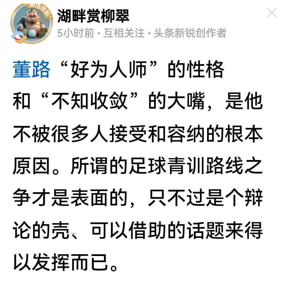 u15惨败日本队之后,董路说大卫的打法没有出路。有球迷为此辩护,批老董“好为人师”。 当下国内以球员出身的青训人士几乎都不认同老董以赛带练之路,非要关门练技术;老董则老想拉队伍去西班牙打比赛,想闯出另一条路。 “从娃娃抓起”几十年来,国足用实践证明,闭门造车练表演技术是一条死路;而批老董的业内人士却不能证明,西班牙娃娃、日本娃长期打比赛是多严重错误。请问,国内的青训比西班牙青训强在何处?