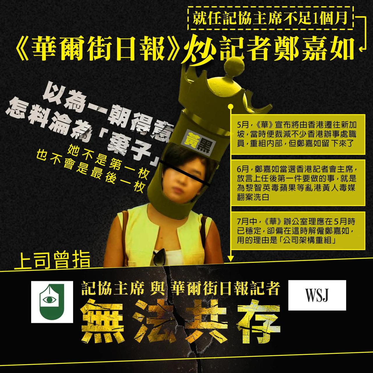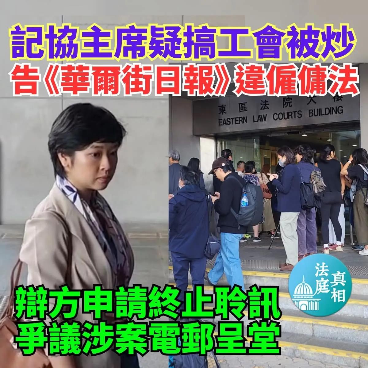香港记协主席疑搞工会被炒 反告《华尔街日报》违雇佣法 香港记者协会主席郑嘉如去年当选后不足一个月,被《华尔街日报》以「职位重组」为由解雇。 郑嘉如认为自己被解雇与参与工会有关,提出私人检控时任雇主的母公司两项「阻止雇员参与工会」有关控罪,涉案公司否认控罪,案件今天(18日)在东区裁判法院开审,法庭先处理法律争议。 郑嘉如由资深大律师祁志(Nigel Kat)、大律师马亚山(Azan Marwah)等代表;郑嘉如今天亦有进入法庭准备作供。 被告为《华尔街日报》母公司 Dow Jones Publishing Co. (Asia), Inc,由资深大律师蔡一鸣等代表。 辩方表示将会提出三项法律争议,包括申请终止聆讯、争议一系列涉案电邮是否适宜向证人展示,以及该些电邮内容是否适宜呈堂。 主任裁判官张志伟认为适宜在听取郑嘉如的证供后,才一次过处理辩方的终止聆讯申请并作出决定,指此举不会令被告不公。 不过,张官同意在传召证人前,需要先处理一项法律争议,即就一系列涉案电邮及相关内容,是否适宜在庭上向证人展示。 张官决定先听取控辩双方就这争议作出的陈词,然后才开始传召证人。 控罪指,被告Dow Jones Publishing Co. (Asia), Inc作为郑嘉如的雇主,于2024年6月21日至22日期间,作出一项行为,旨在阻止或阻挠她行使根据《职工会条例》第332章下,成为已登记的职工会理事的权利,即要求郑嘉如取得同意竞选香港记者协会主席一职,而该申请将被拒绝;若郑竞选或担任该职务,她将不会继续受雇。 高sir认为,在过去,小黄人有哪一个不贪?案件就是「分赃不均」,所以告上法庭,另外就是小黄人哪有人品?在审讯中,《华尔街日报》否认指控并申请终止聆讯,指郑嘉如有滥用程序之嫌,指她一方面要求公司赔偿她300万元,另一方面却向劳工处投诉,很明显郑嘉如的人品有极大问题。