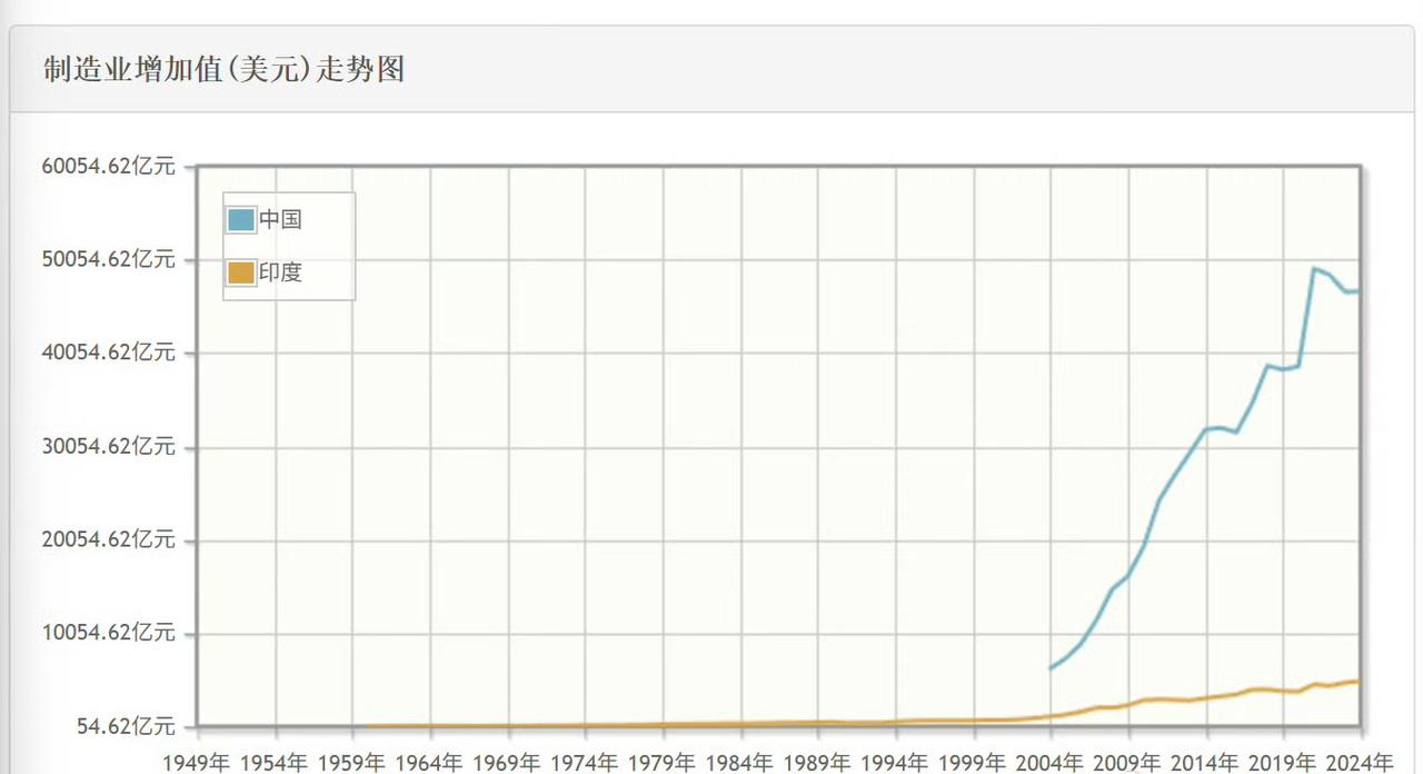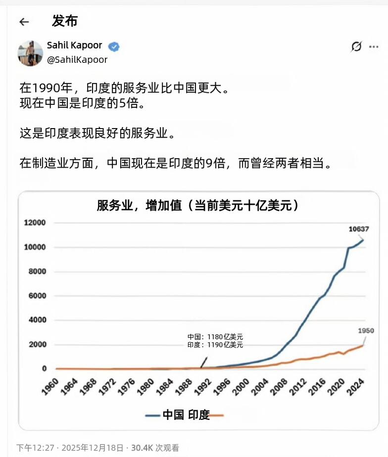 印度人一天天的没事干,尽拿中国和他做对比。 在1990时,印度和中国的服务业几乎持平,中国1180亿美元,印度1190亿美元,印度比中国多10亿美元。 2024年,中国是10637亿亿美元,印度是1950亿美元,中国现在是印度的5倍还多。 在制造业方面,中国现在4.7万亿美元左右是印度5000亿美元的9倍,而二十多年前,曾经两者差距很小。 据学者测算,今天的印度在商品出口上落后中国17年。外汇储备落后19年。外商投资落后20年,科研专利上,差距拉大到至少21年。 这种比有什么意义呢?难不成20年后你就能达到中国现在的高度?综合性发展影响因素太多,完全没必要比,如果非要比,比的人那一定是阿三。 下次比,你们只能和美国比了,byebye!
