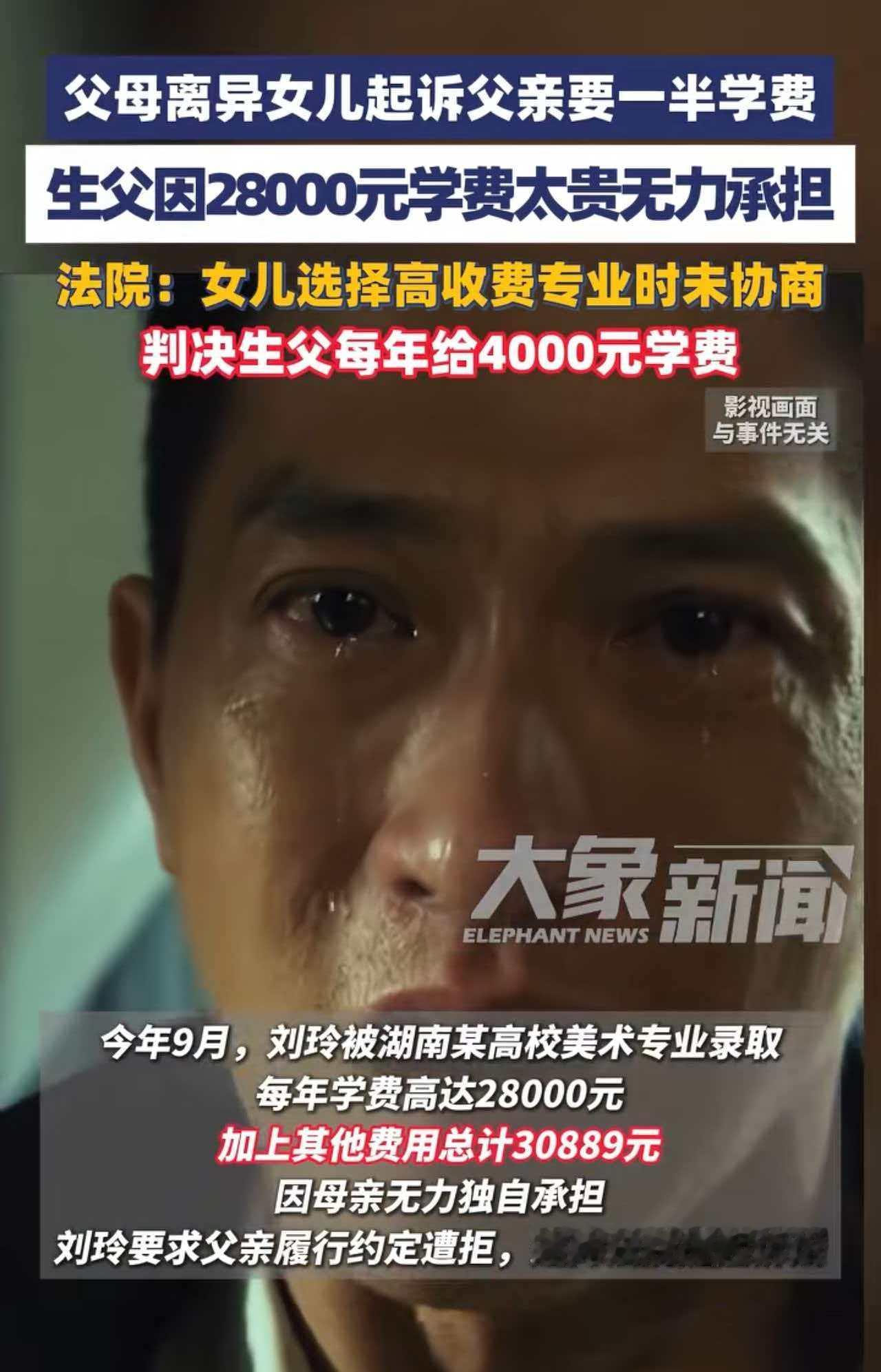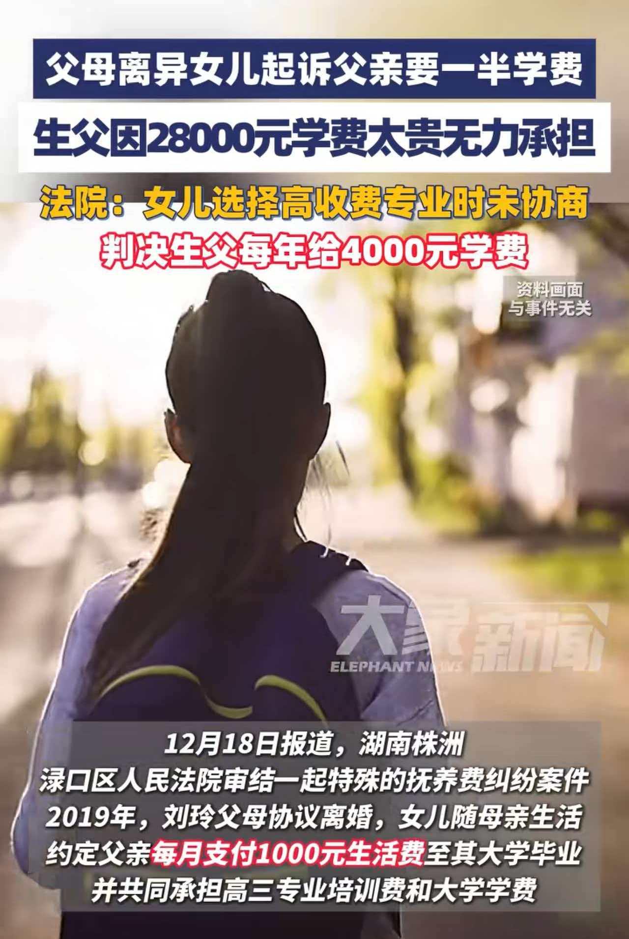 5000多元的学杂费,彻底断了十几年的父女情。 女孩在高三的时候,父母协商离婚,她跟随母亲生活。父母两人约定共同承担孩子高三的学费和补习班费用,父亲每个月再额外承担抚养费1000元。 令人可喜的是,今年女孩考入了某大学的美术系,终于圆了自己的大学梦。 然而,不得不面临的残酷现实是,这是一相当烧钱的专业。仅第一年的学费和其他费用就30889元。母亲表示无力承担,需要父亲共同承担。可父亲表示自己已经失业,而且身患重病,无力承担。 万万没想到的是,女孩一纸诉状将父亲告上了法庭,讨要这一部分费用。 法院则根据普通大学的标准进行核算,父亲需要承担一半的费用是5000多元,另外继续支付每月1000元的生活费。 女孩憧憬的大学生活,以这样不完美的方式开头,到头来,父亲面临的结果可想而知。 在孩子上学期间,他掏了钱,然而,在孩子毕业参加工作后,会不会给他养老也是个问题。 女孩也是的,父亲已经说明了自己有困难,可以找亲戚协商,或者社区介入,也断不可将父亲告上法庭啊! 这一鲁莽的背后,也将亲情推到了万劫不复的地步。 当女孩成年有自己的家庭后,如果面临同样的问题,她又该如何作出自己的选择呢?