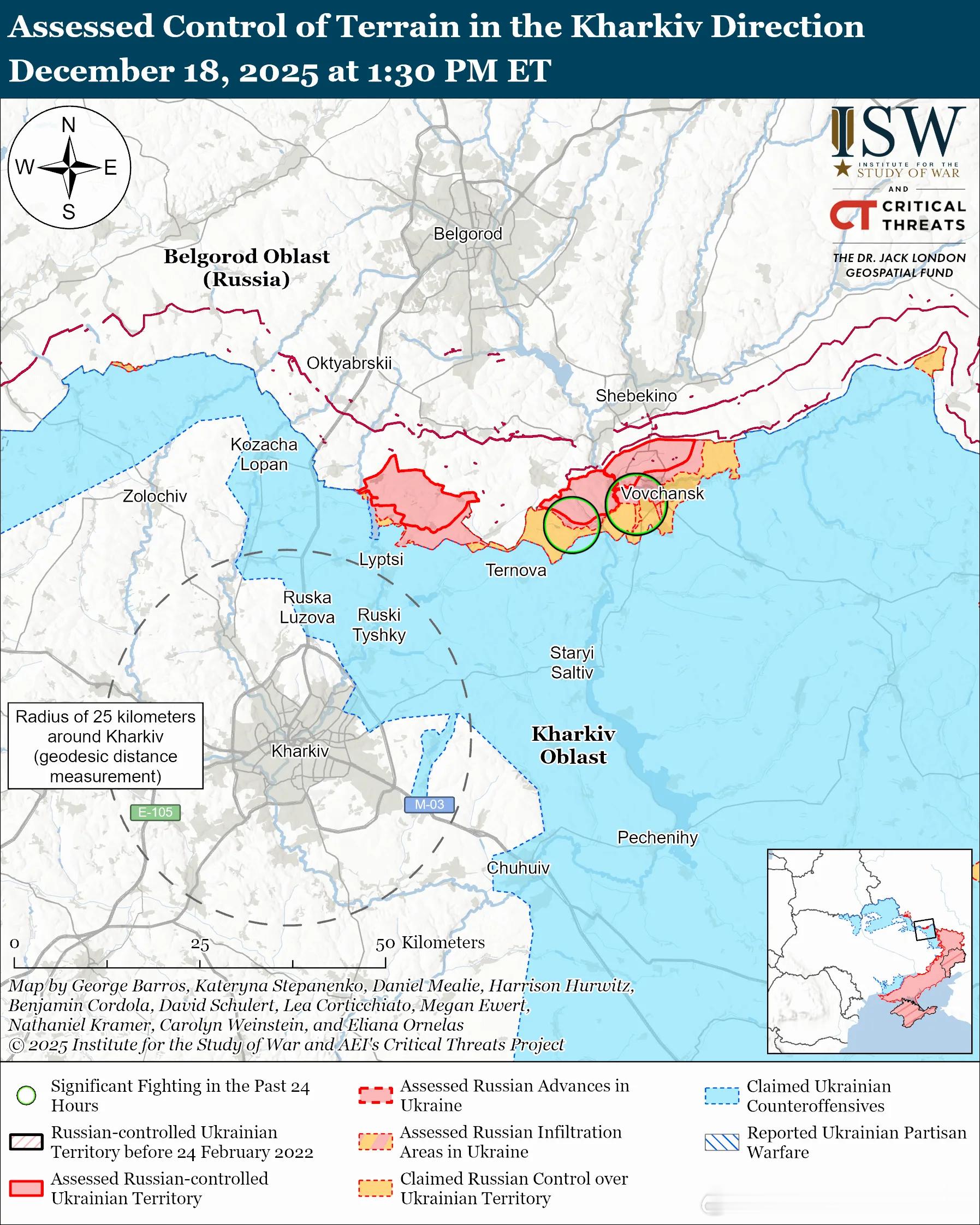 俄罗斯主要行动:乌克兰东部俄军主要行动1俄罗斯的目标:将乌克兰军队从与别尔哥罗德州接壤的国际边界击退,并使其进入哈尔科夫市的火炮射程之内。12月18日俄军继续在哈尔科夫州北部开展军事行动,但并未取得确切进展。未经证实的说法:一位俄罗斯军事博主声称,俄军已向沃夫昌斯克以南推进。[23]俄军于12月17日至18日攻击了哈尔科夫市以北的利普齐(Lyptsi)以及哈尔科夫市东北部靠近斯塔里齐亚(Starytsya)、伊兹比茨克(Izbytske)、莱曼(Lyman)、沃夫昌斯基库图里(Vovchanski Khutory)、沃夫昌斯克(Vovchansk)、普里利普卡(Prylipka)和维尔恰(Vilcha)的方向,以及奥赫里米夫卡(Okhrimivka)。据称与俄北方部队集团有关联的军事博客作者于 12 月 18 日声称,俄军指挥部向在哈尔科夫方向作战的第 7 摩步团(第 11 军,列宁格勒军区)派遣了 50 名新兵,以加强该团的兵力,但其中三分之一的新兵要么超过 70 岁,要么身患重病。12月18日俄军继续在韦利基布尔鲁克方向发动进攻,但并未取得进展。12月17日和18日,俄军在韦利基布尔卢克东北部的米洛韦、哈特涅和多夫亨克附近以及韦利基布尔卢克东部的奥德拉德内附近发动了进攻。