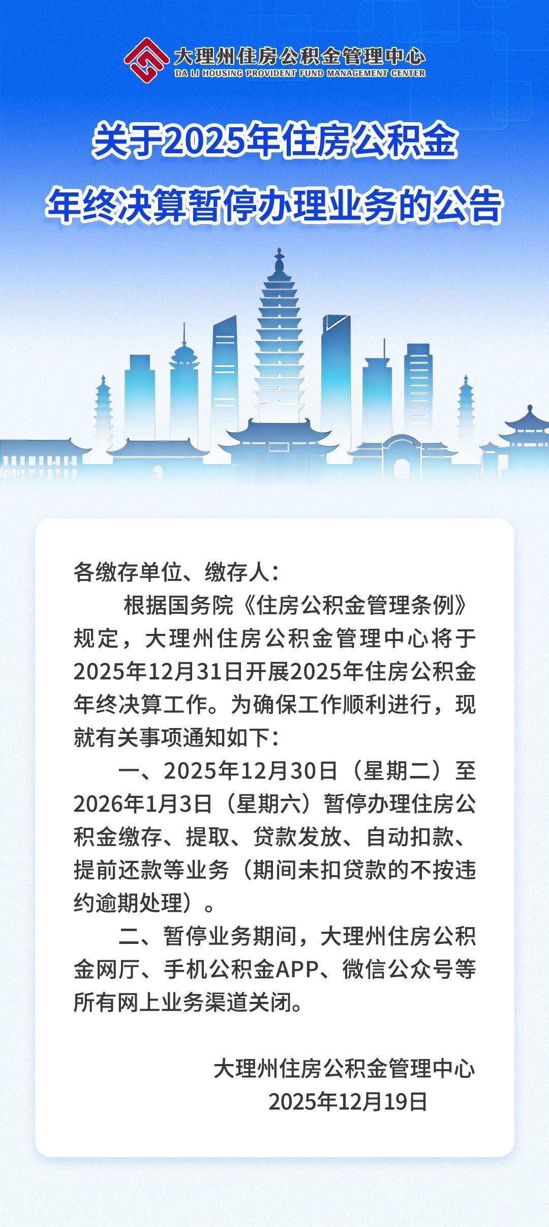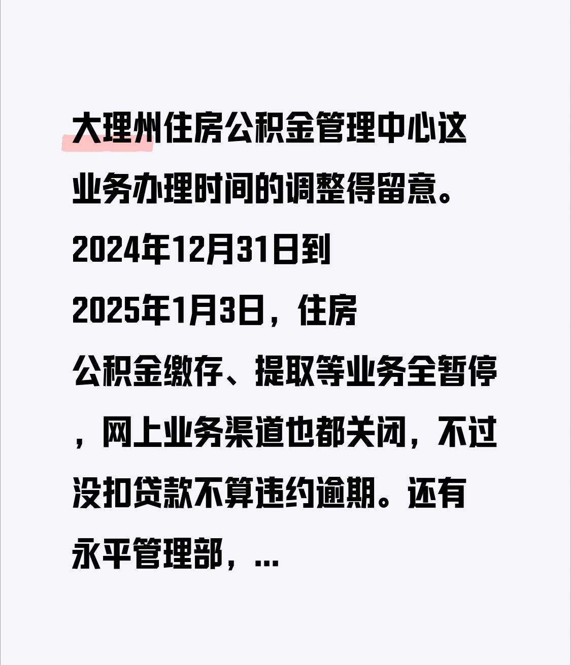 大理州住房公积金管理中心这业务办理时间的调整得留意。2024年12月31日到2025年1月3日,住房公积金缴存、提取等业务全暂停,网上业务渠道也都关闭,不过没扣贷款不算违约逾期。 还有永平管理部,因搬迁2025年1月13日至15日暂停窗口业务,线上业务正常。1月16日上午8点,窗口业务会在新址永平县博南文化园南楼政务服务中心一楼恢复。要办理公积金业务的朋友,可得按这些时间好好规划,免得白跑一趟。 公积金政策流程 公积金办理 公积金支取方法 公积金提流程