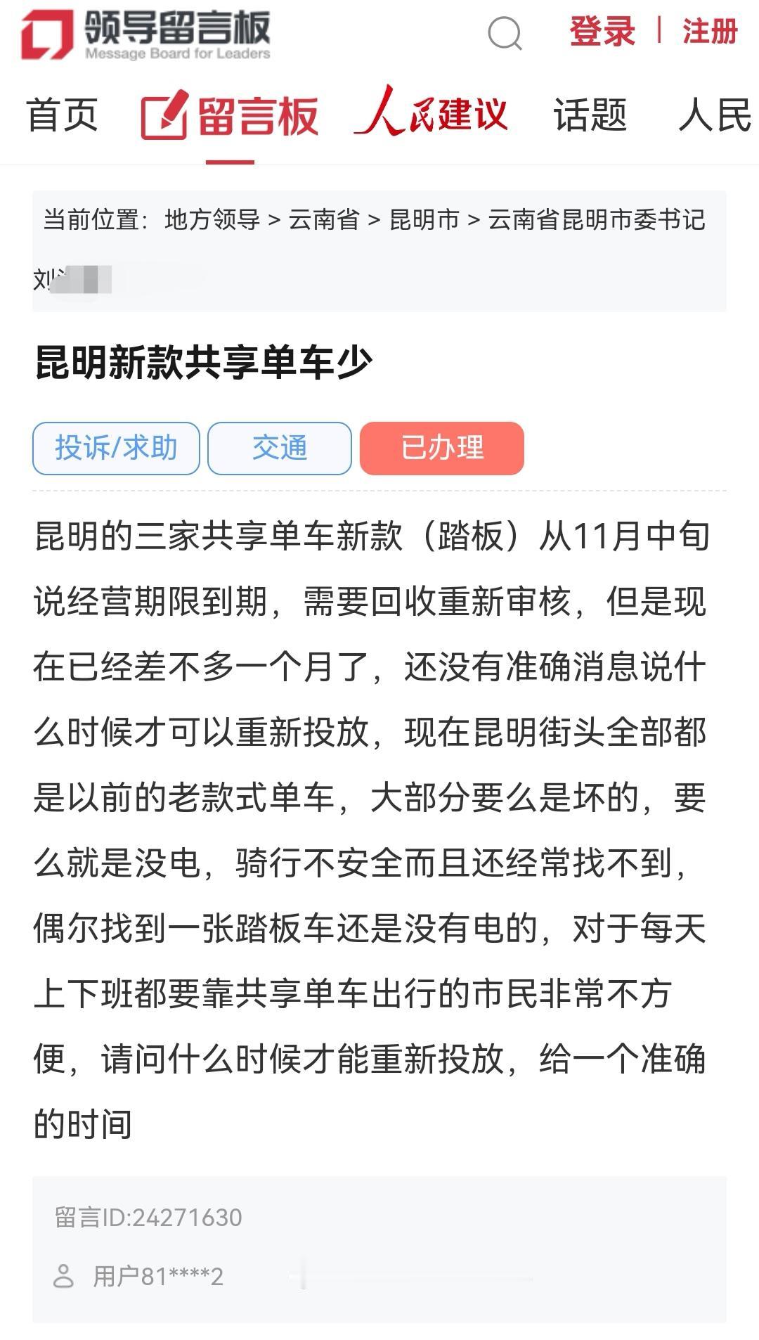 昆明共享单车断档一个月,市民急问新车何时上路? 昆明市民近日通过人民网留言反映,主城区新款共享单车已停摆近一个月,老款车故障多、电量不足,严重影响日常出行。官方回应称,清局、美团、哈啰三家运营商因运营到期,且此前违规投放无牌电动车,目前正进行总量管控和清理回收。 2025年8月起,昆明多部门联合约谈企业,要求清理违规车辆,避免无序投放。过渡期间将加强热点区域车辆调度,缓解出行难题,并对当前不便致歉。市民期待的新款共享单车还需等待运营主体最终确定。在此之前,老旧的小黄车可能仍是街头主力。