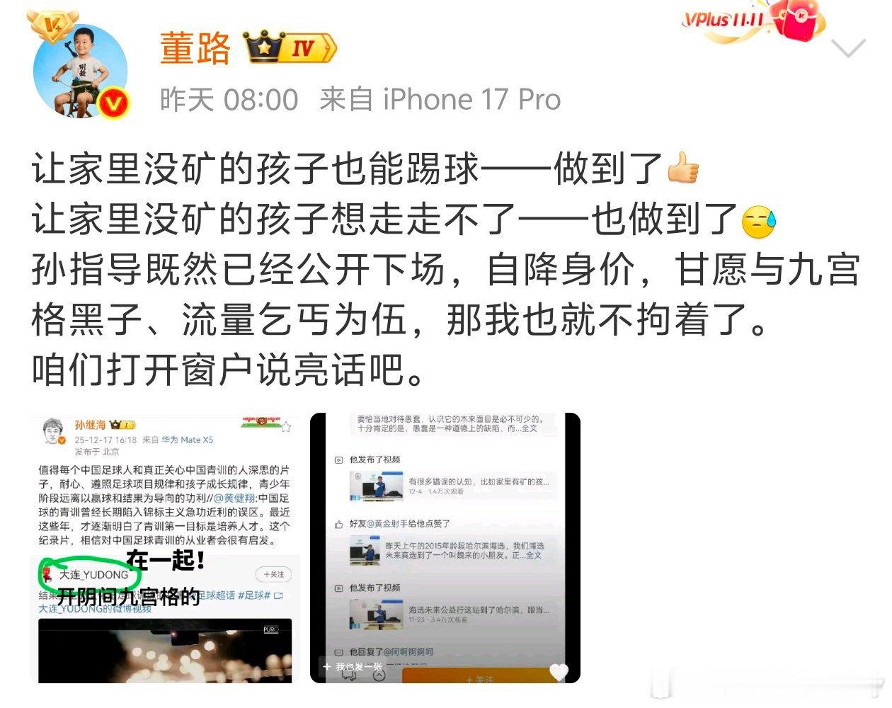 足球青训的话语权之争,专业出身的看不上非专业出身的。专业人士包括评论员都在组团批判董路。孙继海等专业派认为青少年阶段应苦练基本功,远离锦标主义,远离以赢球为导向的功利主义。董路等野路子认为基本功是伪命题,应在比赛实战中培养,基本功不是脱离实际场景的带传射,除了狭义的基本功之外,更应该有应对高强度比赛的球商,空间意识,体系概念,实战技巧等。要在赢球中树立自信。专业派说另一方功利,培养方式错误,浪费孩子天赋,是真人秀。包括公开发声,召开座谈会,或者论坛的形式批斗野路子,有点名门正派围攻光明顶的意思。野路子有更广泛的群众基础,民意支持率较高,批判另一方是故步自封,坐而论道,批判和孩子签约,限制孩子未来发展。在对现阶段国足普遍失望之后,国足的比赛基本没人看了,大家都把专注力都放到了青训上,这成了一个新赛道,形形色色的足球人都开始涌入。基于意识形态,价值观,或者既得利益,就必然会有话语权的争夺。中国足球都这个吊样了,还在那里争,自己做自己的,最后用成果说话就完了。专业的又如何,自己都踢的那个吊样,还批判这个那个的,非专业的又如何,也不一定就不行,所以多元探索才更好。