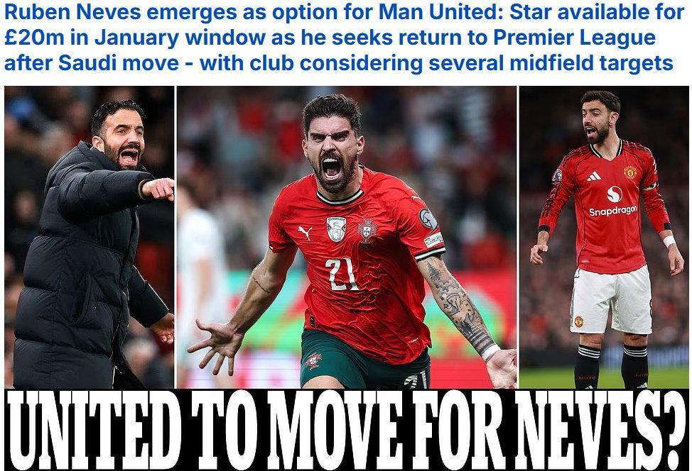 【曼联2000万抢签鲁本内维斯】《每日邮报》CHRIS WHEELER:目前效力利雅得新月的28岁葡萄牙国脚中场,鲁本-内维斯,是曼联在一月冬窗的引援目标。2023年夏窗,这名前狼队中场以4700万英镑转会利雅得新月,双方签下的3年合同,将在2026年6月到期。由于鲁本-内维斯渴望重返英超联赛(他在沙特已经赚到确保未来生活的薪水),会考虑在一月冬窗转会。基于合同期只剩下半年,鲁本-内维斯的转会身价将会低至2000万英镑,加上曼联在后腰位置明显缺人(梅努想走,乌加特不堪重用),冬窗提前出手比夏窗免签更具操作性。PS:2000万英镑绝对是实惠价,看看一月冬窗的转会大戏!