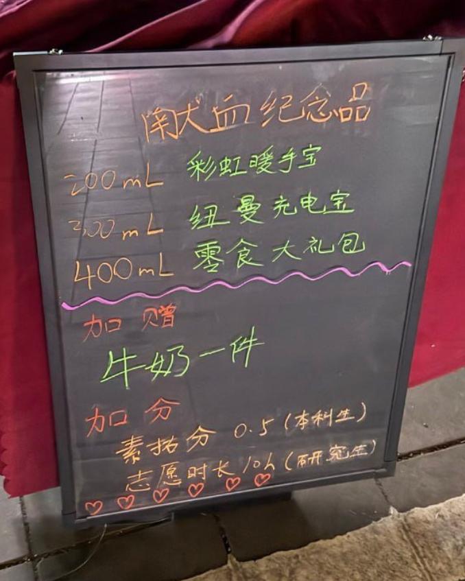 “只要你献血超过400毫升,就可以获得零食大礼包一份,另外还能额外获得一箱牛奶!” 这是一张献血纪念品公告栏。 近日,在重庆某所大学内出现了献血车辆, 明确告知,只要您能献出小小的400ml, 就能免费领取零食大礼包, 还有牛奶一箱, 以示纪念。