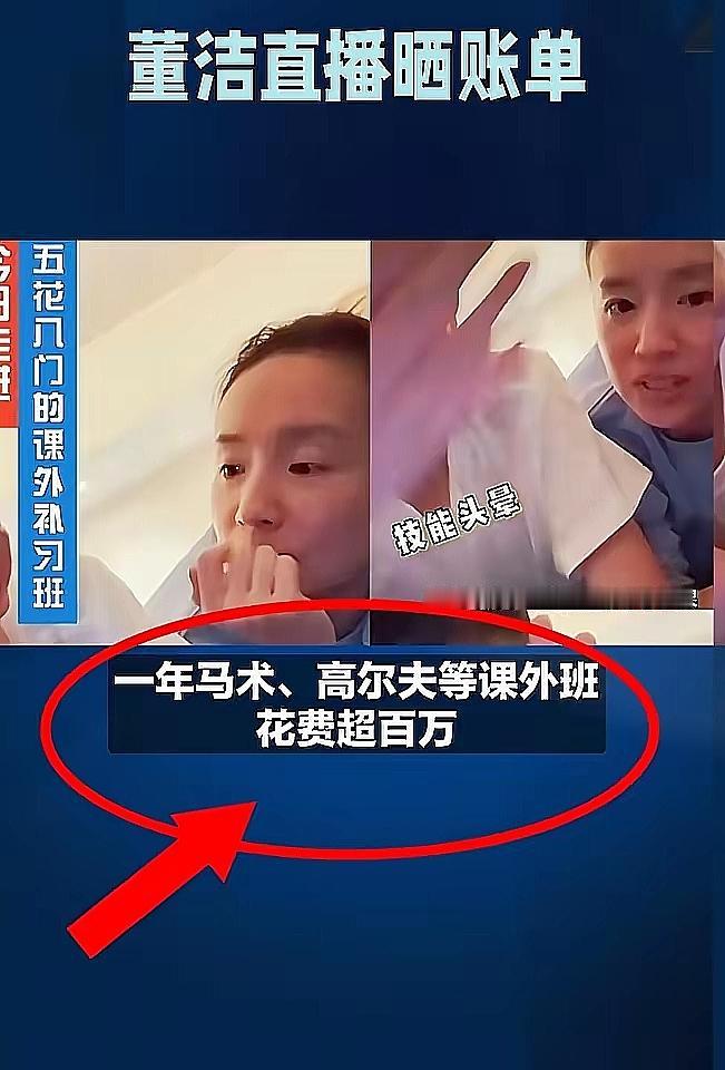 惊掉下巴! 董洁居然说快养不起儿子了。这可不是她夸张,直播间晒出账单,儿子顶顶一年光课外班,马术、高尔夫、钢琴、架子鼓啥的,妥妥超100万。 她觉得这些课对孩子成长必不可少,还陪孩子学马术,找专业团队护航,一起进步。董洁也表明,这是自己有能力后的选择,不同阶层消费观念不同。 网友的评论那叫一个实在:“你这负担是咱普通家庭不敢想的起点,咱还在纠结百元美术课报不报。”也有人觉得不算凡尔赛,父母嘛,都想给孩子最好的。 依我看,养娃真没个统一标准。董洁有能力多投入,普通家庭精打细算也是爱。关键都盼着孩子好。不用攀比给家庭增加负担,咱普通家庭量力而为就好。大家说是这个理不?