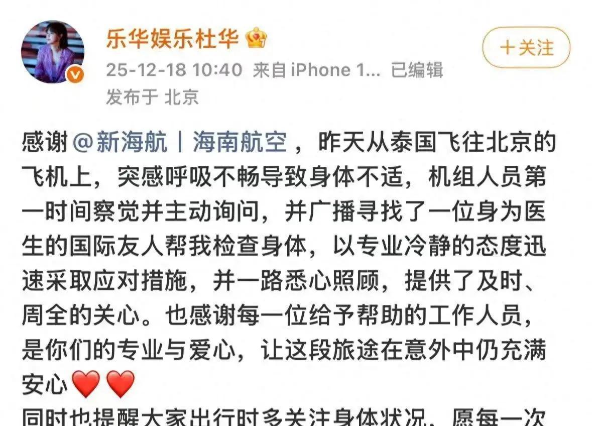 娱乐圈大佬杜华最近有点小惊险!12月17日,她刚从泰国曼谷飞回北京的海南航空航班上,突然觉得呼吸困难,身体难受。幸好空乘小哥小妹反应超快,立刻过来关心,还通过机上广播找了个同机的医生朋友帮忙检查,一路细心照料,让她顺利平安落地。 事情得从前一天说起,12月16日在曼谷举办的2025泰国头条新闻年度风云人物颁奖典礼上,杜华作为乐华娱乐老板,拿下了“年度中泰文化突出贡献奖”,这奖项认可了她这些年推动中泰娱乐交流的努力。乐华从2009年起步,现在已经是港股上市的头部公司,手握王一博、韩庚等一堆明星,业务遍及音乐影视综艺。 海南航空这边也靠谱,他们说飞机上备有急救设备,平时遇到乘客不舒服,就赶紧问情况、找医生帮忙,严重了还能备降。杜华事后特意发文感谢,觉得这服务太暖心了。 说实话,现在飞机上突发状况不算稀奇,但航空公司和机组的专业处理真能救急。这事也提醒大家,出门在外尤其是长途飞行,得留意自己身体,别硬扛。海南航空这种标准化服务,值得点个赞,让人坐飞机更放心。希望中泰文化交流越来越火,大家出行都平平安安!(298字