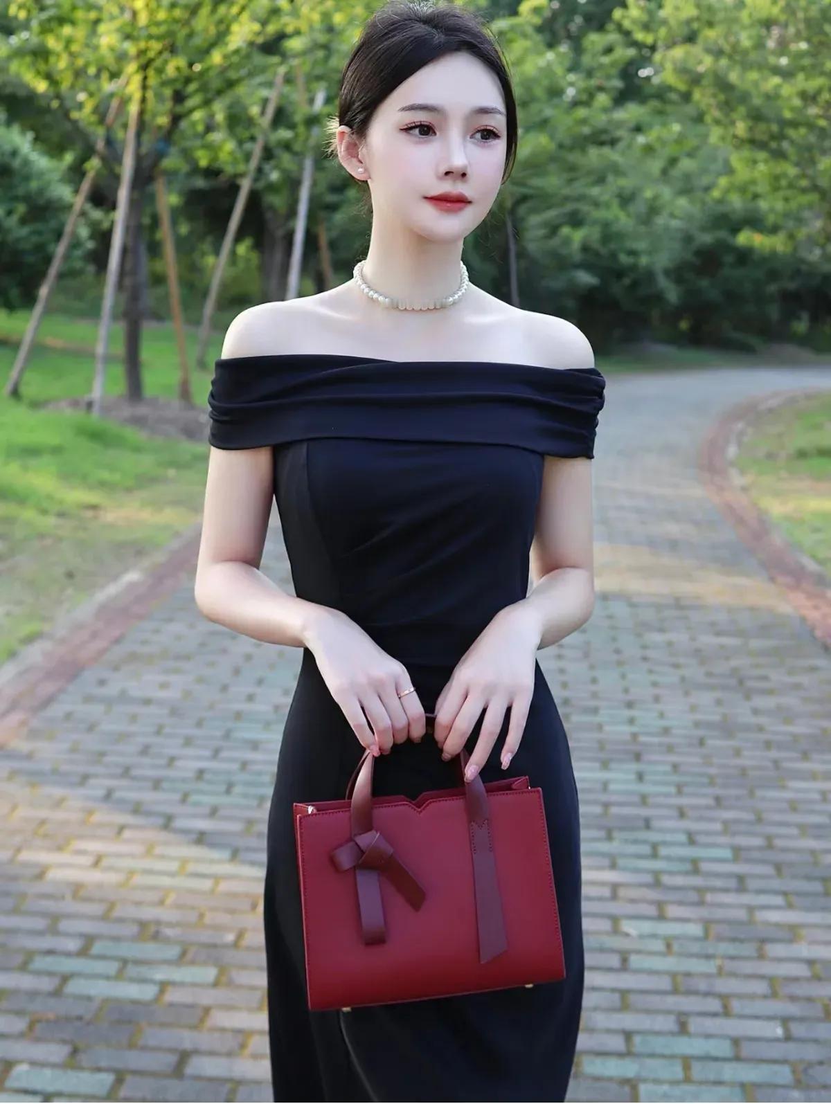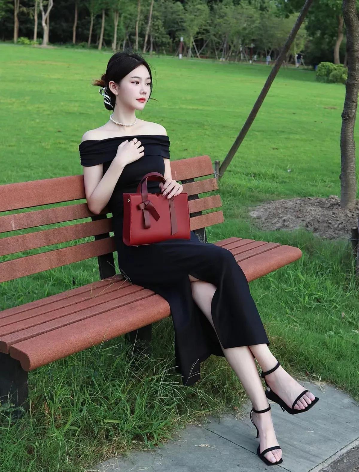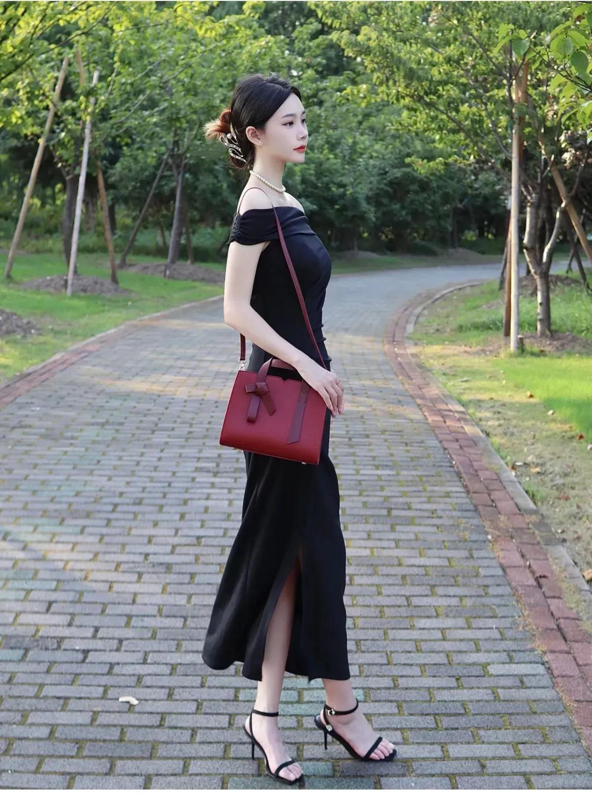 这套穿搭是优雅性感的黑红撞色轻礼服风,简约中带着高级张力。黑色一字肩长裙自带优雅气质,修身版型+开叉设计凸显身形曲线,露肩细节恰到好处,缎面材质更显精致质感。 红色手提包与黑色礼服形成撞色,瞬间提升造型吸睛度;黑色高跟凉鞋简约利落,与礼服风格呼应,强化了优雅感;珍珠项链点缀,让整体更显精致得体。能充分展现穿着者优雅性感的轻熟魅力。怎样完成气质风穿搭 女生穿连衣裙如何能显的成熟