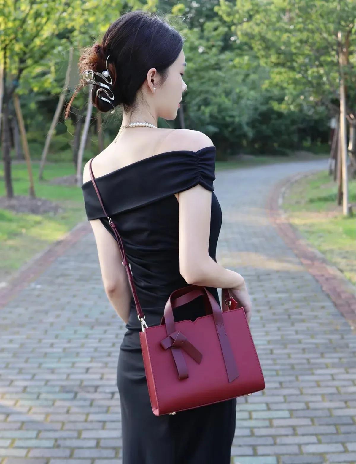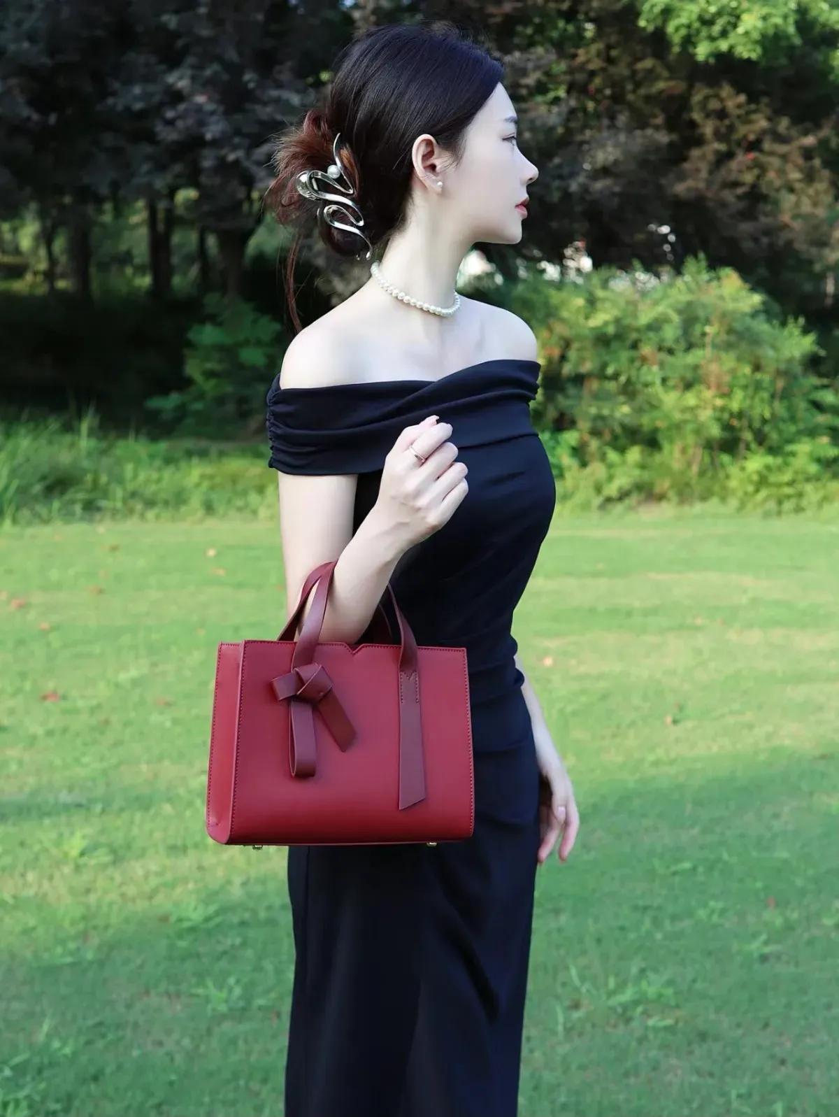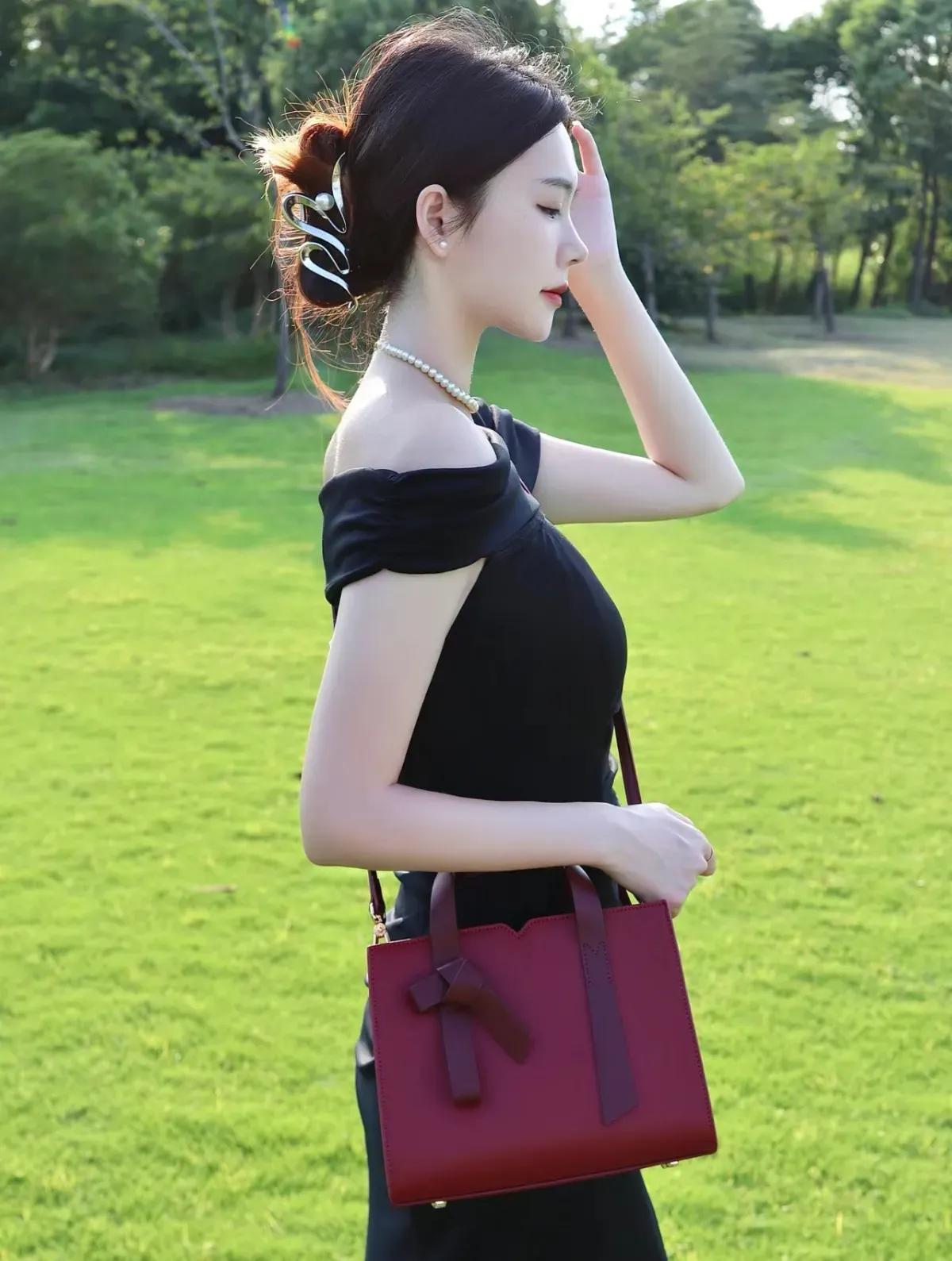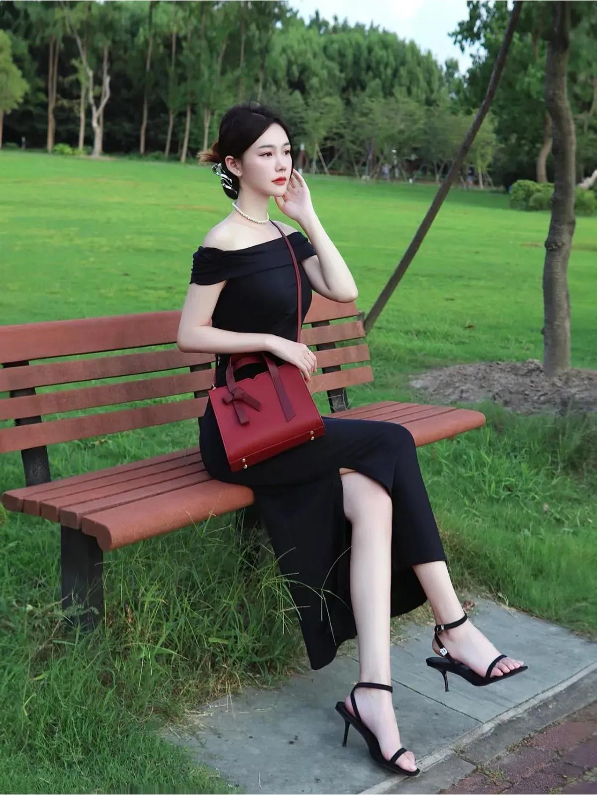 这套穿搭是优雅性感的黑红撞色轻礼服风,简约中带着高级张力。黑色一字肩长裙自带优雅气质,修身版型+开叉设计凸显身形曲线,露肩细节恰到好处,缎面材质更显精致质感。 红色手提包与黑色礼服形成撞色,瞬间提升造型吸睛度;黑色高跟凉鞋简约利落,与礼服风格呼应,强化了优雅感;珍珠项链点缀,让整体更显精致得体。能充分展现穿着者优雅性感的轻熟魅力。怎样完成气质风穿搭 女生穿连衣裙如何能显的成熟