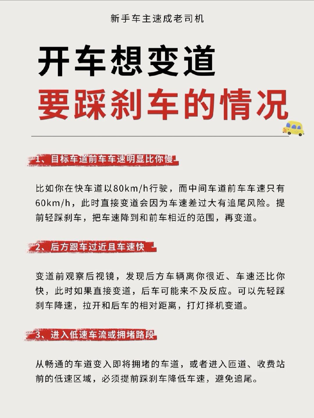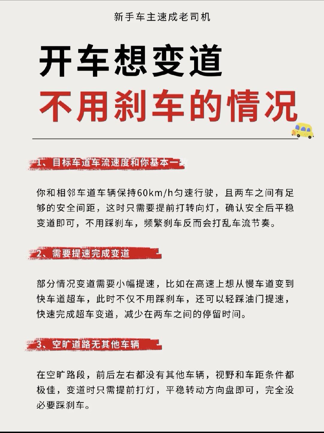 变道到底要不要踩刹车?看看这里你就懂了👏要轻踩刹车的情况1️⃣前车比你慢很多2️⃣后车跟得近、车速快3️⃣要进拥堵/低速区不用踩刹车的情况1️⃣车道车速差不多,车距够2️⃣需要加速变道时💡变道正确步骤①提前观察后视镜,左右都要看。②打转向灯,至少3秒。③判断车速,该刹就刹,该加速就加。④平稳转动方向盘,一次变到位。⑤变完关灯,正常行驶。汽车大v聊车