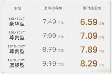 A级车的价格B级车的配置,全新帝豪6.59万起,4款配置选谁?第5代帝豪出了4个版本,限时感恩价6.59万元起,看着是不是挺诱惑?那么这四款车该怎么选才不吃亏,或者说最性价比呢?第5代帝豪照比前代还是有进步的,前脸格栅尺寸更大,看起来也更立体,两条LED日行灯带置于灯腔内,整个前脸给人一种怒目而视的即视感。车长4815mm,轴距2755mm,快接近B级车了,A级车的价格B级车的尺寸,“加量不加价”。而6.59万的入门版,也就是1.5L CVT豪华型,比较能拿得出手的配置有定速巡航,自动空调,倒车影像,再有就是那个Flyme Auto。仪表盘是那种老式的组合仪表,中控屏的尺寸也只有10.1英寸,而这么大的车子,轮毂只有16寸,这配置要是放在三年前,跟朗逸轩逸比还能有点儿性价比,放现在就根本不够看,当然,如果就是预算卡的死死的,别的要求没有就想找个日常代步,这配置也可以考虑,而但凡预算宽裕点,都可以往下看。加5000块钱预算可以拿到1.5L+CVT尊贵型,轮毂从16寸升级到17寸,看着更大气,中控屏升级到14.6英寸,看导航更清晰,组合仪表也变成了10.2英寸的液晶仪表,此外还多了电动天窗,360全景影像,倒车雷达,后排出风口,透明底盘,侧气囊和L2级辅助驾驶,对新手停车更友好,跑高速也更轻松。这款在四款里面的性价比也是最高的,适合追求实用又想买的划算的小伙伴。如果想开的爽,可以再加8000块钱选1.5TD+7DCT尊贵型,吉利星瑞相同动力,最大马力181匹,零百加速7.9秒,看谁还敢说帝豪“肉”?几年后动力衰减,也不用担心起步太慢被后车“滴滴”。而且根据官方的数据,1.5T版本的油耗百公里5.95L,比自吸版本还低。而水晶挡把,50W手机无线充也一并赠送,手机放上就能充电,还是比较方便的。这款也比较推荐。再加4000块钱,就是顶配1.5T DCT旗舰型。和1.5T DCT旗舰型相比,主要是多了主驾电动调节,外后视镜电动折叠和前排座椅加热等舒适性配置。主驾驶的电动调节,可以轻松找到令自己感觉舒服的角度,而前排座椅加热能算得上冬季神器,要是天冷的时候打开,坐在座椅上不会觉得座椅冷冰冰的,再多花6000元就能选装千里浩瀚H3驾驶辅助系统,跟L2辅助驾驶比起来强得有限,主打提供情绪价值吧。还是之前跟大家说的话,合适自己的才是最好的,要是不着急马上用车,也可再等上一阵,就凭着现在这么卷的势头,说不定等过段时间,这车优惠力度会更上一层楼。