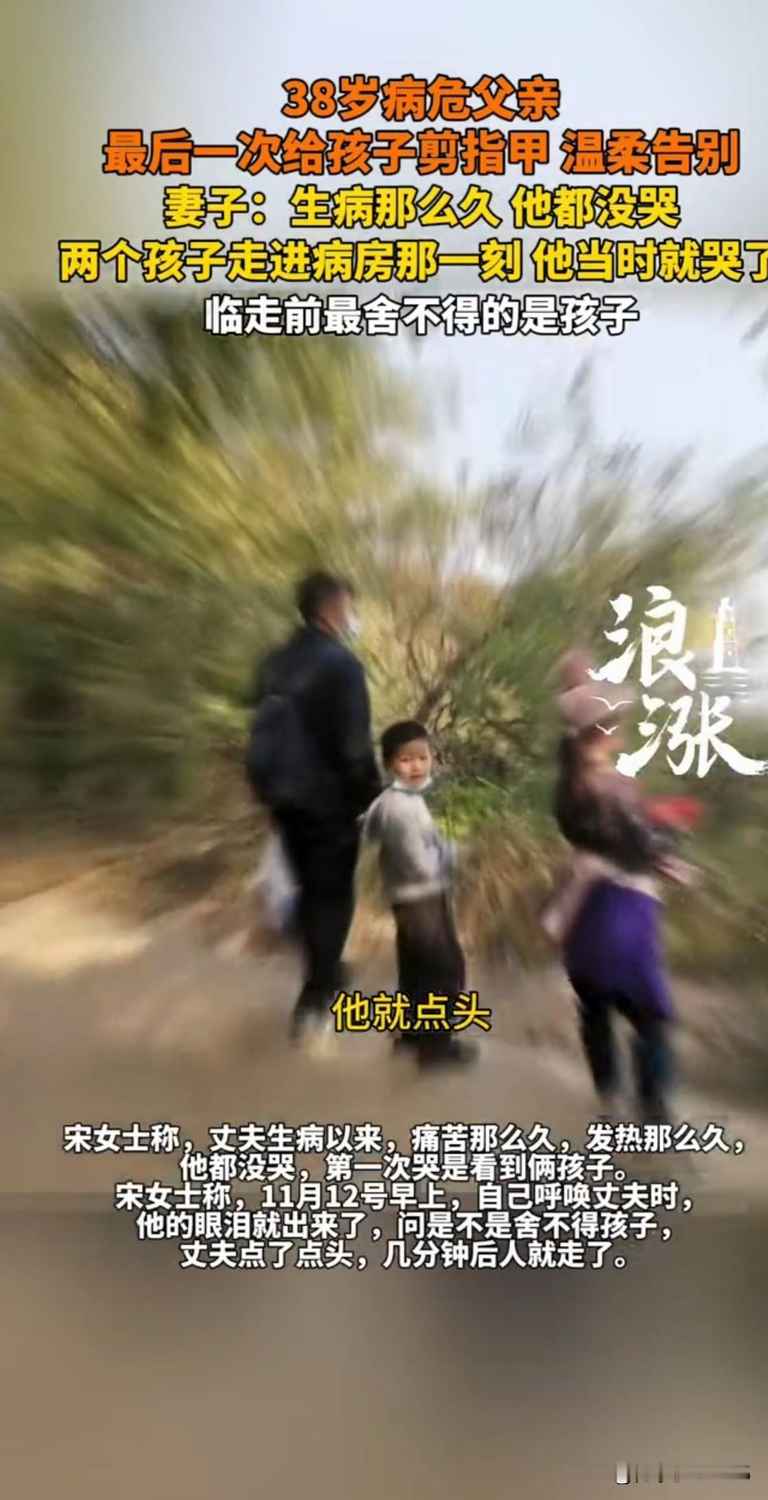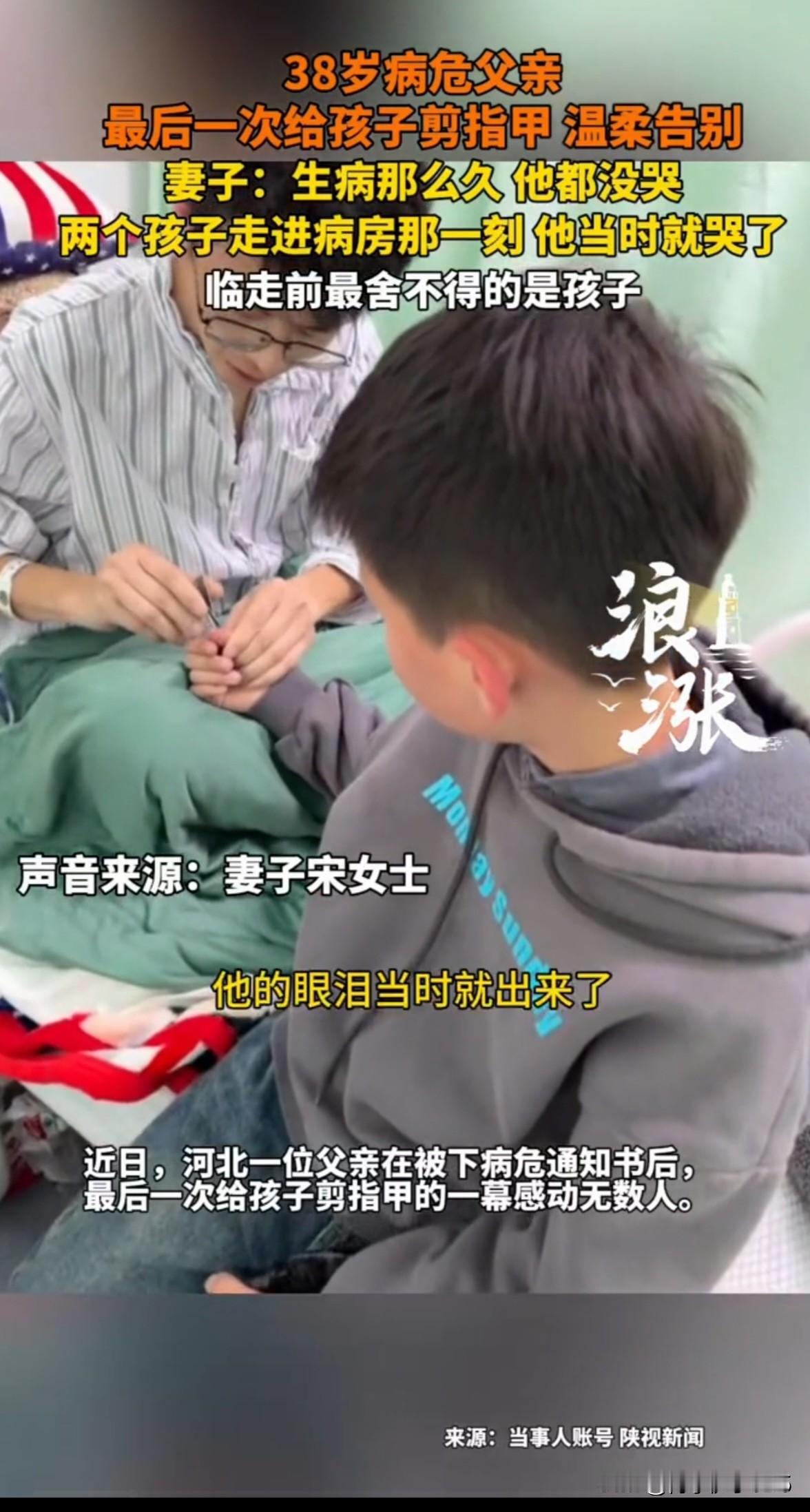 河北一位父亲在被下病危通给孩子剪指甲的一冪感动无数人。 12月18日,妻子宋女士称夫今年10月份因为肝膝肿去医院检查, 后情况就常不好,一直在住院。 11月3号,医院给孩子爸爸下了病危通知书, 38岁病危父亲最后一次给孩子剪指甲温柔告别!妻子:生病那么久他都没哭 两个孩子走进病房那一刻他当时哭了 在这个瞬间,许多人或许会觉得眼眶湿润,心中泛起一股难以言喻的情感。38岁的父亲,面对生命的尽头,用最温柔的方式,给孩子最后一次剪指甲。这一幕,像一束微光,穿透了无数家庭的阴霾,也让我们重新审视“父爱”的真正意义。 或许我们都曾在日常琐事中忽略了父母的付出,甚至习以为常。但当生命的天平开始倾斜,才发现那些微不足道的小细节,才是父母最深沉的爱。那一刻,他没有选择抱怨命运的不公,没有在病床上流泪,而是用行动告诉孩子:无论生命多短暂,父亲都愿意用尽全力,守护你们的每一寸幸福。 这不仅仅是一个家庭的悲欢离合,更是一面镜子,映照出我们每个人心中的责任与爱。我们是否还记得,曾经在父母的背影下偷偷掉泪的模样?是否也曾在他们的关怀中感受到那份无声的温暖?而如今,面对生死的考验,我们是否还能保持那份坚强与温情? 这段视频在网络上引发了广泛的共鸣。有人留言:“父爱真伟大,无声胜有声。”有人感慨:“生命如此脆弱,却也如此坚韧。”更有人开始反思:我们是否在忙碌的生活中,忽略了陪伴父母的时光?是否应该在他们还在的时候,多一些关心和陪伴? 这个故事提醒我们:生命没有彩排,每一刻都值得珍惜。父亲用最后的温柔,诠释了什么是真正的爱,也让我们明白,无论未来多么不可预知,爱与责任永远是家庭最坚实的支柱。 也许,生活中我们都在追求所谓的“伟大”,但最打动人心的,往往是那些细水长流的温情。让我们都学会在平凡中发现不平凡,在细微中感受伟大。因为,生命的意义,不正是在于那些点滴的爱与陪伴吗?当我们再次回头,是否也能像这位父亲一样,用行动告诉家人:我在你身边,直到最后一刻。爸爸生病感悟 手术伤感 亲人手术 温柔告别 离别