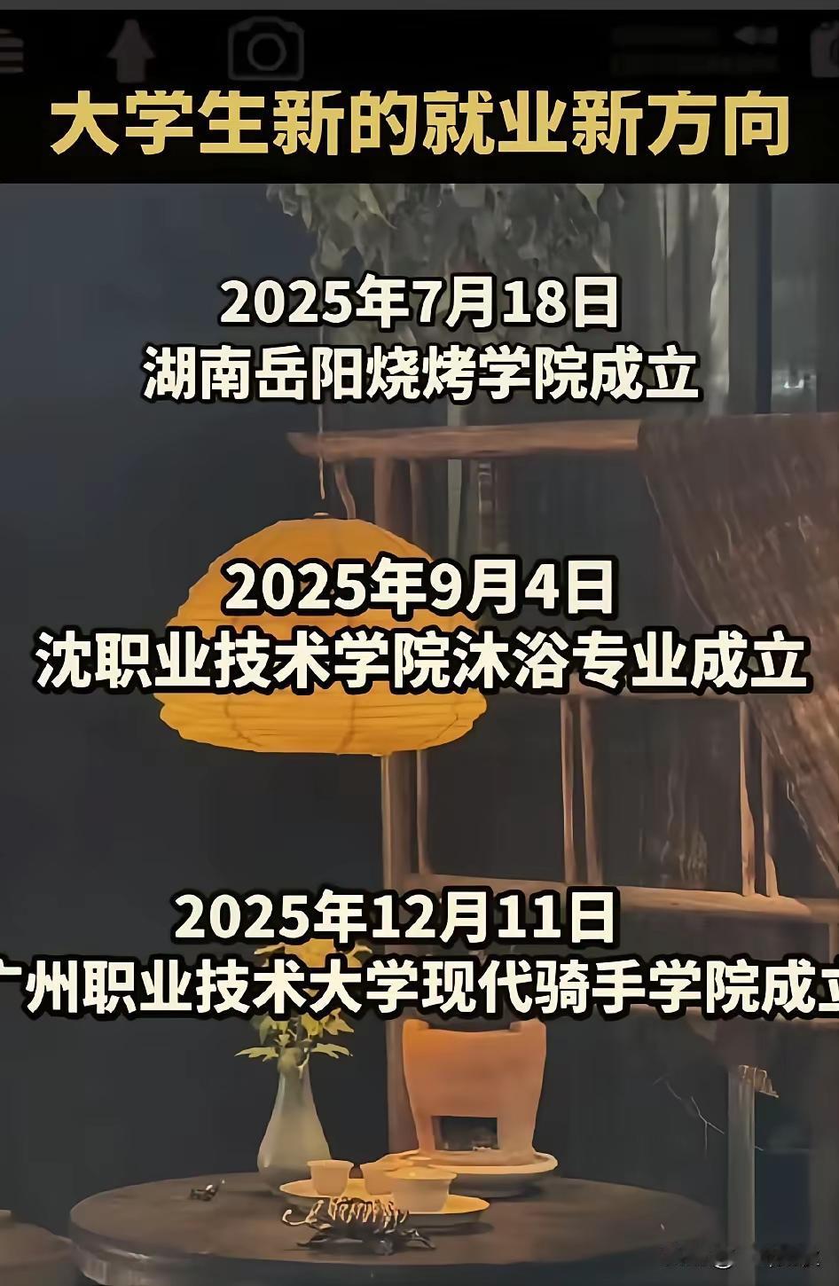 烧烤、沐浴也成为大学的专业了,还有什么骑手学院,不是AI制作吧? 如果是真的,以后还会有送外卖学院,出租车司机学院,太让人意外了,现在出什么奇怪事都不稀奇,以后会越来越多。