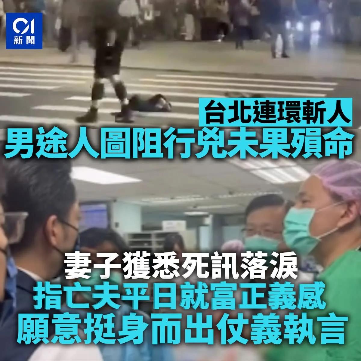【台北随机伤人事件 台媒:增至4死多伤 死者包括疑犯】 台北连环暴力攻击事件,一名行凶者先在台北车站M7、M8出口附近连续投掷烟雾弹,随后又逃至捷运中山站,沿途丢掷烟雾弹,再闯入诚品南西店并持长刀随机斩人,连环事件酿至少4死、6伤,部分伤者危殆。行凶者之后坠楼死亡。 报道说,事发在下午5时许,疑犯27岁,来自桃园市。他犯案后从高处堕下重伤,送院抢救后不治。 报道引述台大医院证实,因试图阻拦疑犯,中刀重伤的一名57岁男子,在医院伤重不治,他被利刀从右肺贯穿至左心房。 据报道,该行凶者27岁,因「妨害兵役」问题今年7月被桃园地检署通缉。据报道,行凶者本名张文,为台湾人,27岁,因「妨害兵役」问题今年7月被桃园地检署通缉。据了解,张男曾为空军志愿役士兵,服役于松山机场附近的无线电通讯中队,2022年因酒驾遭汰除,2024年11月25日教召未报到遭通缉,防务部门称该行凶者已非现役军人。警方说,张姓犯嫌目前无业,曾担任过保安,并于今年1月在中正区租屋,住家在桃园,经报请台北地检署侦办后,已派员至张男北市中正区租屋处搜索,在屋内发现製造汽油弹的相关材料。警方又说,张姓男子犯案时不慎遗落笔记本,目前已送往鉴识,并针对张男使用手机进行解锁,并将持续调阅监视器画面及访查进一步釐清张姓犯嫌的犯案动机。高sir再一次向遇难的台湾同胞致哀,愿伤者早日康復,我认为事件给予我们香港一个很大的启示,就是安检问题,不似内地,而香港于2004年及2017年分别发生过地铁纵火案,香港保安局应留意。 最后高sir促请台湾省长妥善处理事件,全力救治伤者,检讨事件并确保悲剧不会再发生。