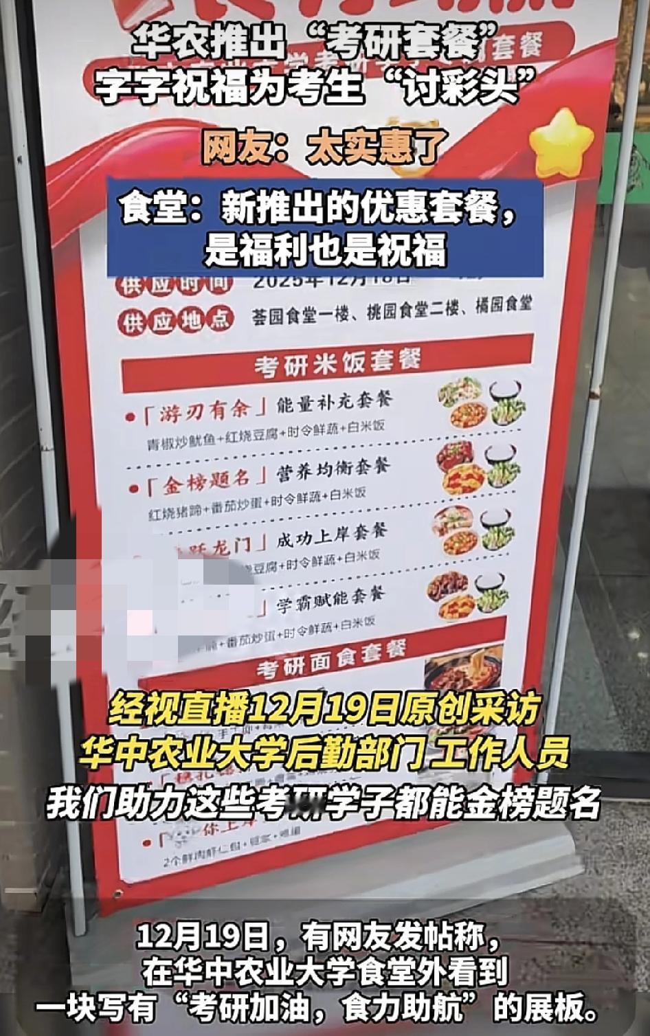 华中农业大学为考研学子们推出了考研套餐,食堂门口一块写满了祝福的展板上,全市未考生们加油打气的,包括游刃有余,牛气冲天,鱼跃龙门,包你上岸。其中包你上岸这个套餐里面就是有两个拳头大小的包子加上一个鸡蛋,一杯豆浆,售价仅需要5元。其他的套餐也都是荤素搭配,加上时令蔬菜,学校表示这是福利,也是祝福。