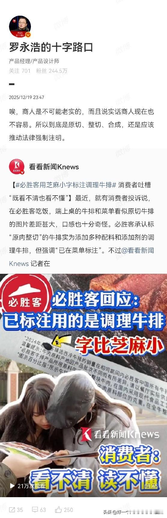 必胜客这种大品牌也搞文字猫腻, 被曝光菜单中用醒目大字标注“原肉整切”牛排, 而事实上是添加了配料的调理牛排, “整切调理”四个字比芝麻还小, 放在角落里不用放大镜都看不到。 难怪平日就喜欢在网上发声的罗永浩又出来对调理牛排说话了, 说牛排到底是原切、整切还是合成的, 都应该推动法律标明清楚。 毕竟消费者现在吃个东西吃得不明不白的, 里面全是这些玩文字陷阱的商家。