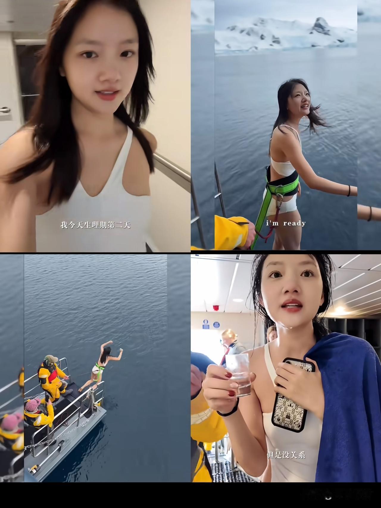 特意去查了下任敏, 真的让我佩服得五体投地, 原来她真的一个人去南极,在生理期第二天就挑战跳水了。 视频中,她尝试了三次,第一次身体前倾,但一下又缩回来;第二次她不停地念叨"我害怕,我不敢";可第三次,没有丝毫犹豫,只听"噗通"一声,转身就跳进了南极冰海里。 出海后,还幽默调侃自己,舔了一口冰,一点都不咸! 有网友羡慕她,有钱真好,可以自由的体验! 但更多网友说,任敏这么跳下去,下个月还能来月经吗? 来不来月经我不知道,但我感觉她很拼,有韧劲!如果哪个老板招到她这样的员工,那就偷着乐去吧!