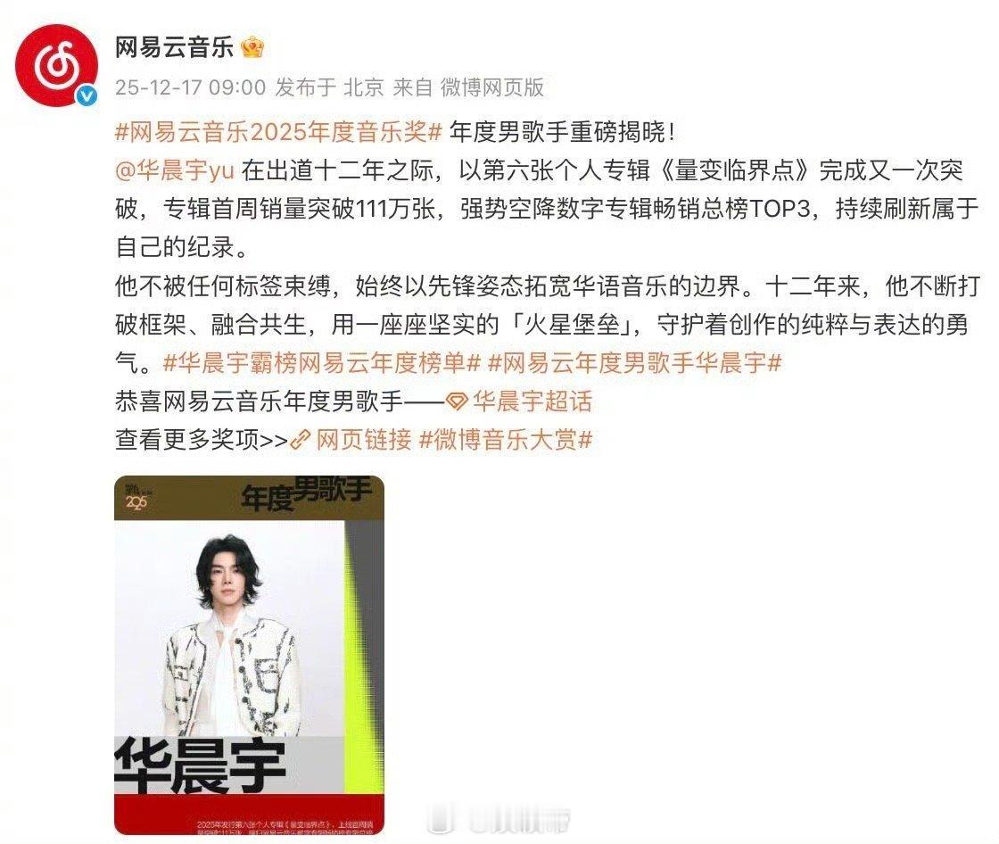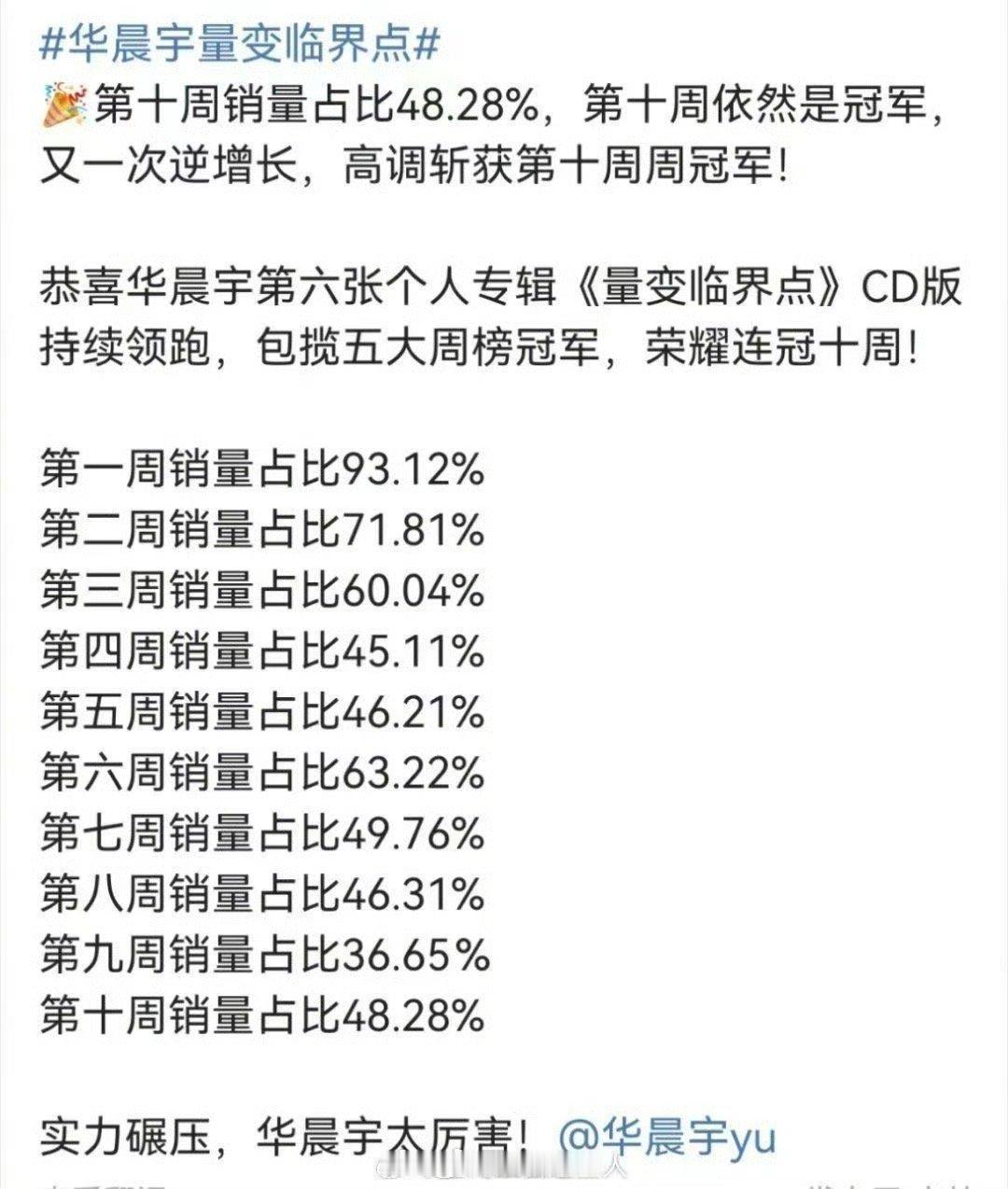 华晨宇 内娱销冠 华晨宇内娱销冠实锤!六专《量变临界点》首周93.12%超高占比,连续十周五大周榜冠军,第十周逆增长尽显硬实力,十年如一日坚守音乐,三字即是品质与销量双重保证