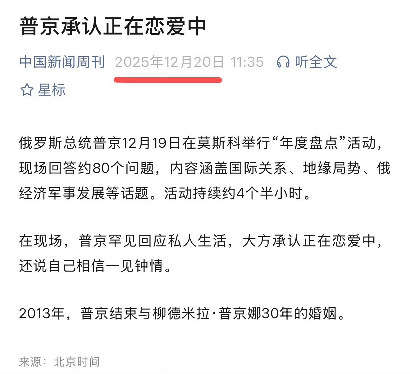 俄罗斯总统普京,承认正在恋爱中…