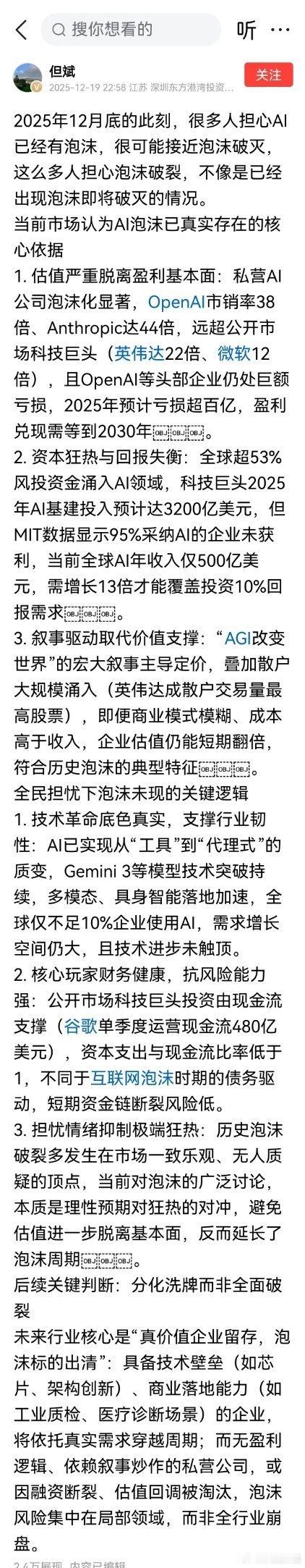 Ai行业严重泡沫? 一、Ai企业估值严重脱离盈利基本面,例如OpenAi市销率38倍,仍处于巨额亏损中。 二、资本疯狂蜂拥涌入Ai公司,但回报失衡。 三、许多Ai公司靠叙事上涨,没有价值支撑。四… 但,一些优秀的Ai公司,具备长期成长及盈利能力,最终将穿越股市牛熊,一路向上。如:英伟达、谷歌和特斯拉。在泡沫破裂时,只有真正优秀的公司才能存活下来。