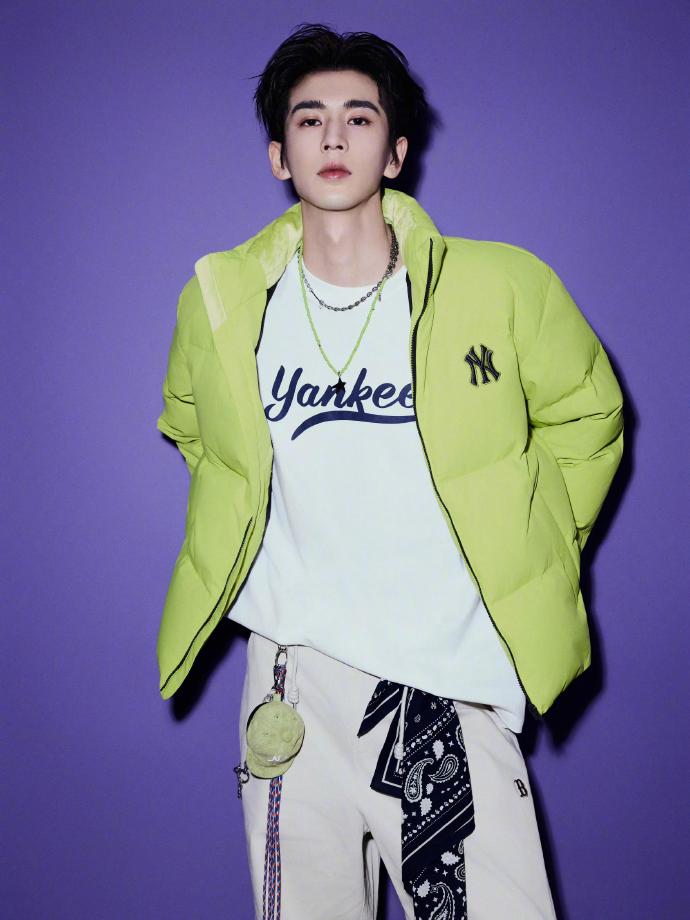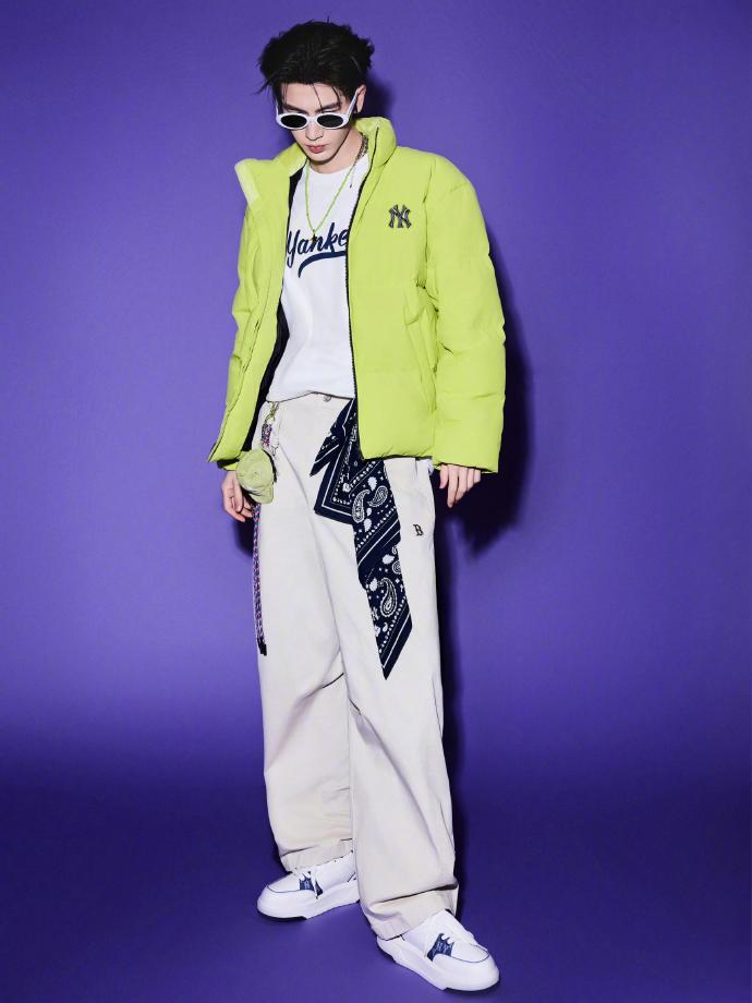 张凌赫MLB造型,身着MLB绿色棉服,搭配清爽大背头,星星项链叠戴凸显时尚个性,完全是酷帅利落的运动男孩一枚