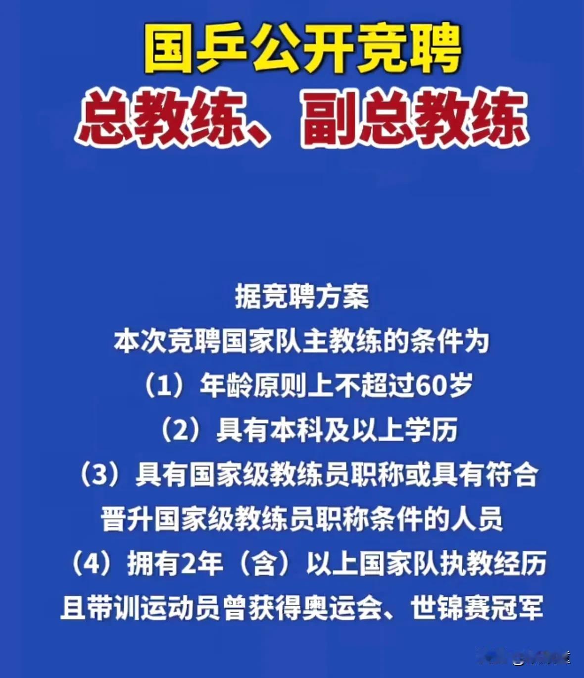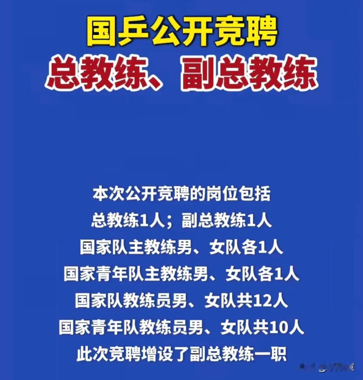 有人说国乒竞聘的国家队主教练是萝卜岗,满足条件的人,一只手都能数过来! 说句不好听的,不是萝卜岗,你以为谁都能干好,能担起这个责任! 这次最期待的岗位还是国家队总教练,以前是李隼,他做的很好,没有什么争议的,也是一步步干起来的! 这次,总教练不知道会不会秦志戬,王皓、马琳二选一有点难,一碗水端不平,难免有矛盾!