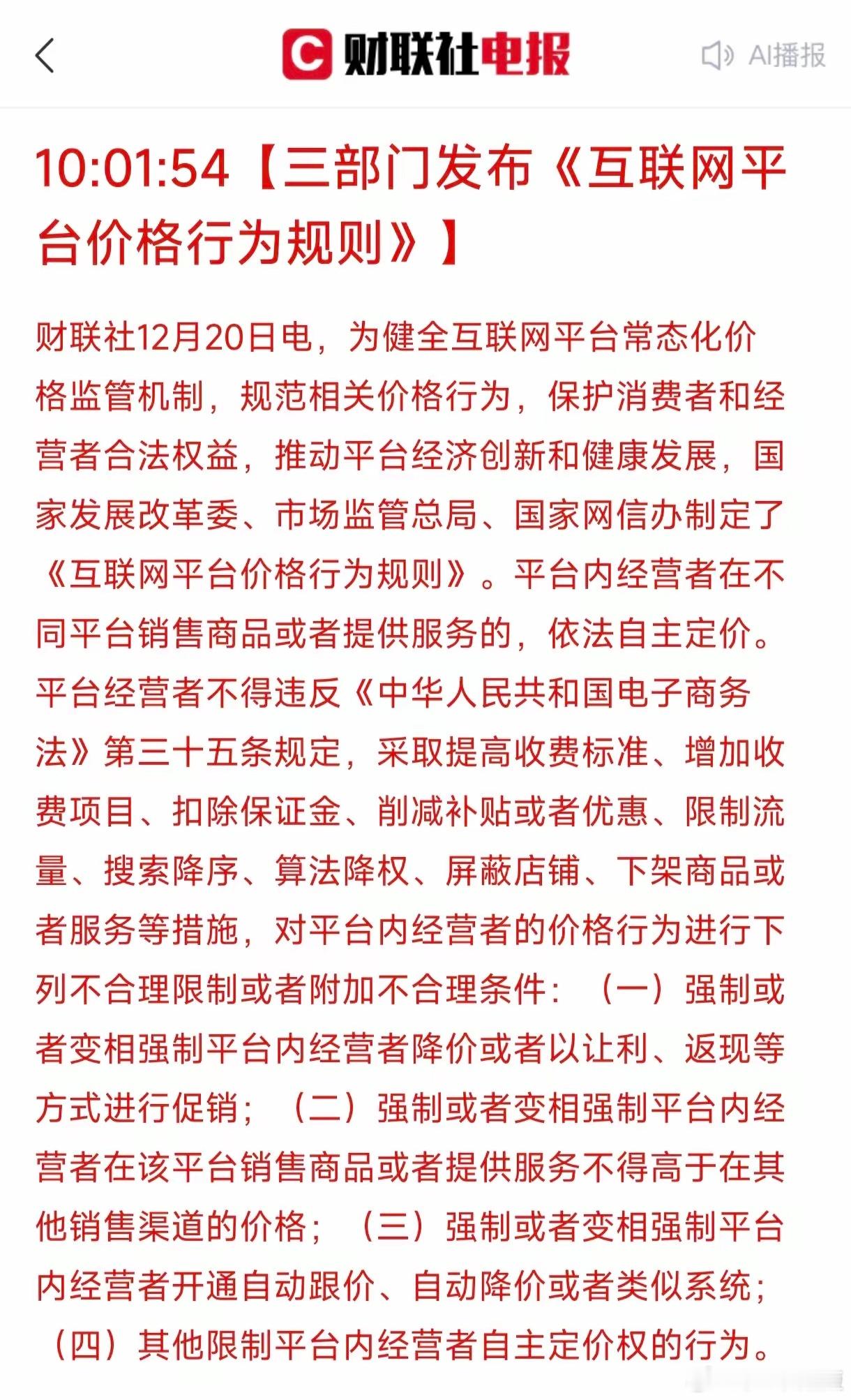 电商商家的重磅利好来了!12月20号,三部门联合发布《互联网平台价格行为规则》,要求维护各平台内商家的自主定价权,比如不得强制降低价格、最低价、开启自动跟价等。对消费者同样是利好,规定保障消费者权益和价格知情权,不得利用算法进行“大数据杀熟”!可以预料到,这个《行为规则》发布后,各家平台会被戴上紧箍咒,互相之间的内卷行为会减少。如果真的可以完全按规则行事,对平台经济长期来说可以得到健康规范的发展,从以前的价格竞争转换为质量服务的竞争!不过,后续还是要看监管强度与实际执行效果。之前就明令禁止过“仅退款”等平台乱象,现如今还是有个别平台会出现这种现象,可见这只是个开始,要促进平台之间的有序竞争,还需要很长的路。