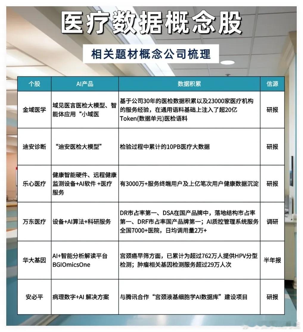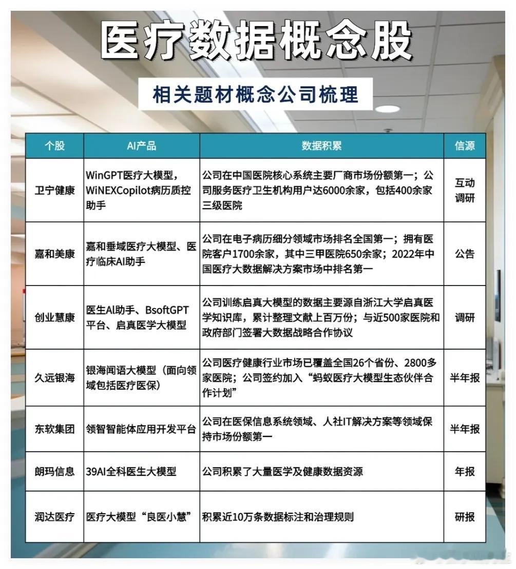 医疗数据 相关题材概念公司梳理🔥据券商观点:“蚂蚁阿福”高效的数据底座,来自于蚂蚁精选和构建的庞大医疗数据集,深度融合了海量院内院外、线上线下、结构化与非结构化数据;重视医疗数据入口价值,医疗IT公司有望迎价值重估。a股