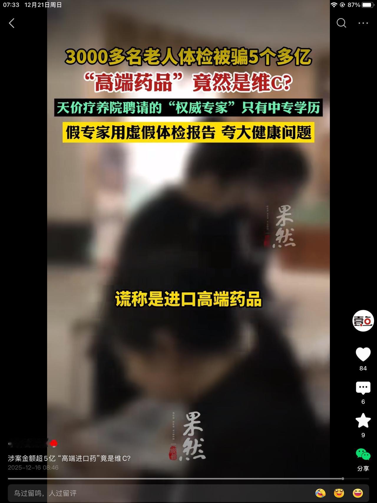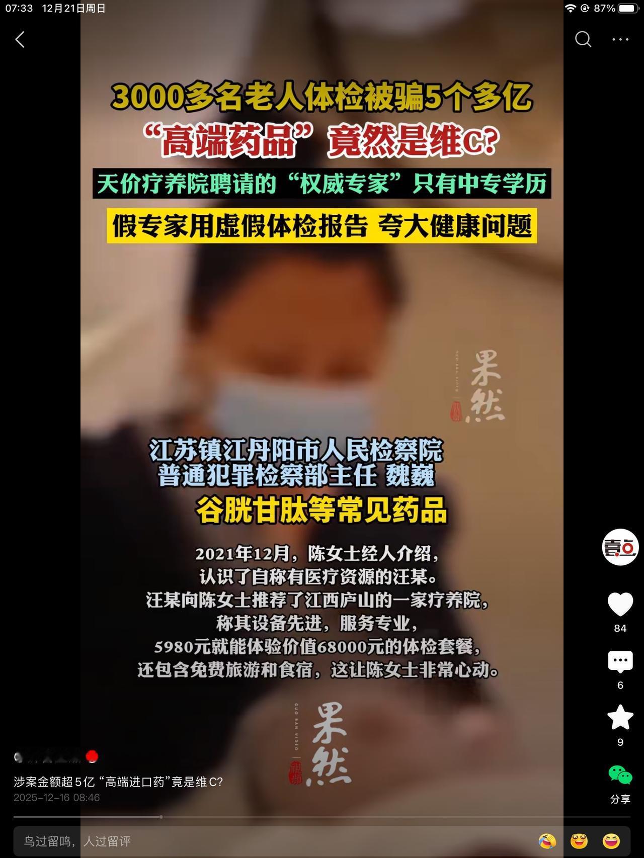 家住江苏丹阳的陈女士在一家疗养院花了四百万元。这里面有“红蚯蚓酵素”“金属硫蛋白”等高端进口药,并能通过肝肾养护,干细胞治疗等项目治疗加保健。 400多万啊!为了生命的质量,真是下了血本了。不知这陈女士家里是做什么大买卖的,能拿出这么多钱来维持维护身体的健康。5980体验68000的体检套餐。这个不太懂,大医院的体检套餐有那么贵吗?为啥不相信医院,相信疗养院?哦,包含免费旅游和食宿,陈女士非常心动。明白了,花小钱,办大事,是这里面优质的套路。很得人心。 平均敌人16万,一共忽悠了3000多名老人。不知我算的对不对。我对几个零不感兴趣,算了好几遍。这些老人大概率有退休金。如果说是普通农民,一是他拿不出这么些钱,二是即使你忽悠他,他也贷款也贷不出来,他没有抵押物。所以,这个群体,受害人就比较少。 退休姐姐们,叔叔们,阿姨们,那都是辛苦工作结束后,得到的退休金,也是劳动后的成果,就这么交给到骗子手中,不知你们作何感想。儿女们都支持吗?还是说儿女们情绪价值给不到位,就这么的花钱买开心。 维生素C,硫酸锌都没毛病,吃点也没毛病。说明人家小骗骗只相中了你的钱,你的命压根人家也不想要。😄