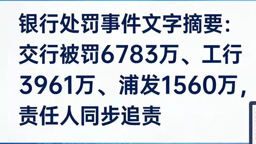 重磅!三家大银行合计被罚超1.2亿,问题出在哪? 2025年12月19日,工行、交行、浦发银行集体吃罚单,总罚款超1.2亿元!交行因账户管理、反洗钱等11项违规被罚6783万,工行涉金融统计、账户管理等问题罚3961万,连17名责任人都被追责,浦发则栽在理财代销和员工管理上。 三家银行均表示相关违规多发生在2023年前,且已完成整改。网友热议:银行频频被罚,金融监管是不是越来越严了? 你觉得这波罚单能起到警示作用吗?