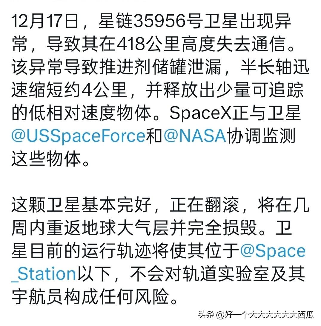 马斯克的星链说到底就是落后产品, 按照星链那质量水平, 如此大量的发射到太空中就是对其他航天器一个最大的未知风险, 已经有研究表明每周涉及约500次与其他航天器小于一定距离的接近, 而且大量的星链卫星坠落, 对于地面上的人和物也是一种潜在威胁, 因为谁也无法预料什么时候从天而降一颗坠落的星链卫星。 这种太空垃圾就应该禁止取消。