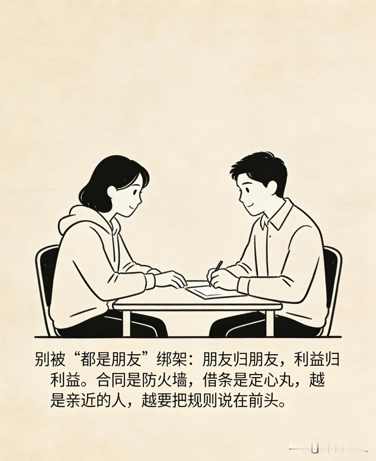 一位过来人说: 无论做什么工作,和谁合作,一旦涉及利益,一定要签合同,口头保证做不得数。还有亲戚朋友跟你借钱这件事,小钱周转一下也就罢了,但要是金额比较大的,一定要让对方打个借条,不要觉得关系好,或者是知根知底的熟人,抹不开面子。要知道,真正把你当回事的人,往往会主动打借条让你安心,不会跟你翻脸,而那些不怀好意的人,就是拿准了你不好意思开口,试图赖掉这笔账。 也就是说,凡是跟利益相关的事,千万不要相信什么口头承诺,一个人嘴上说的越天花乱坠,你就越要警惕。那些喜欢说花言巧语的人,往往最会算计了,你以为对方是贵人,殊不知人家早就布好了一个局,就等着你往里跳了。 很多人之所以栽跟头,就是蠢在不好意思上,被那些社会老油条耍的团团转,吃了大亏都找不到说理的地方。所以啊,签合同的时候,不要嫌麻烦,一定要一字一句看清楚。尤其是熟人合作,更要小心,不要草率,有些人就是知道你信任他,很有可能在那些不起眼的地方做手脚,等你反应过来的时候,早就晚了。 不得不说,那些涉及利益的事,谈钱不伤感情,谈感情才伤钱。无论什么时候,不要为了所谓的面子,把自己置于被动的境地,把丑话说在前面,把规则立在明处,可以避免很多麻烦事。