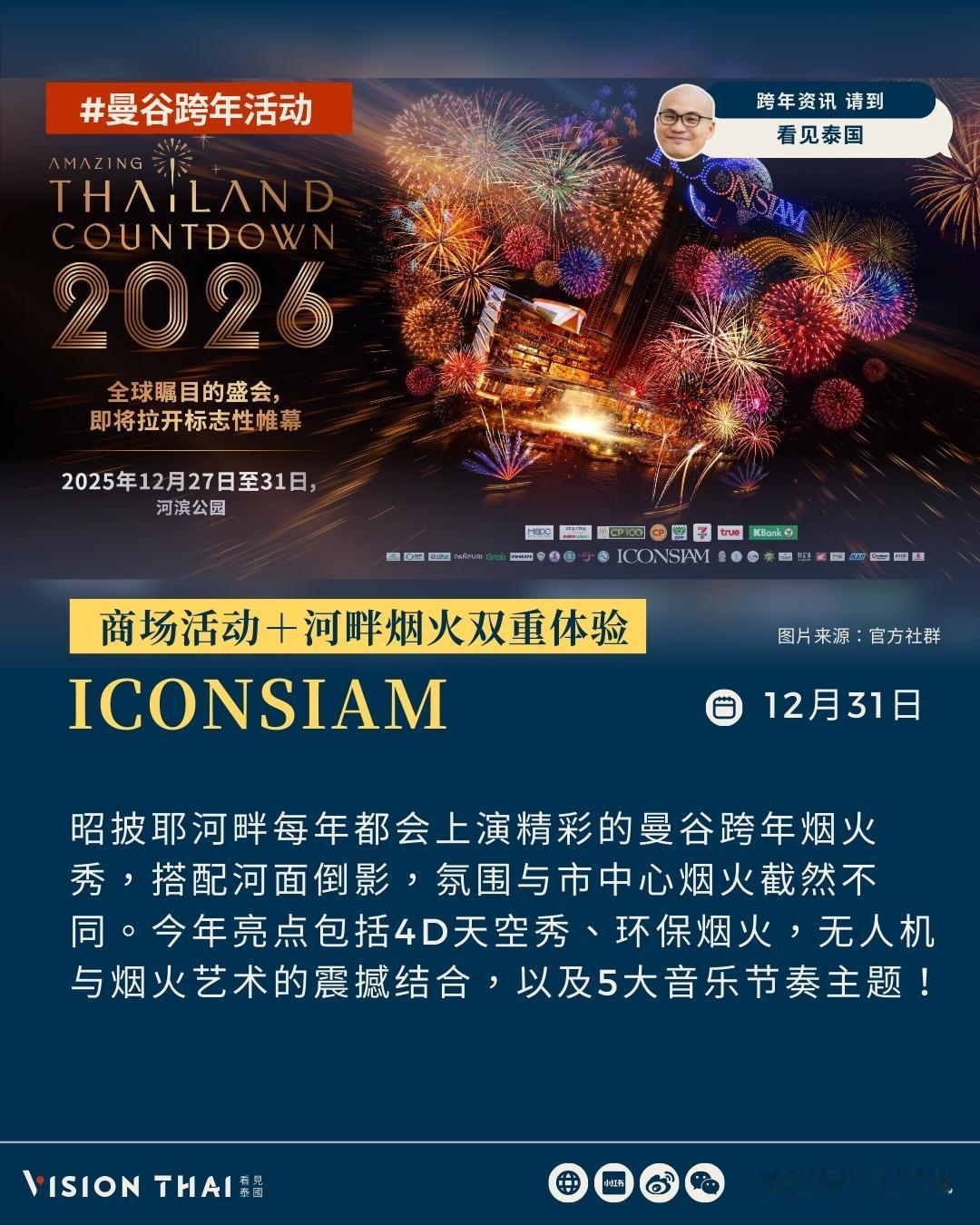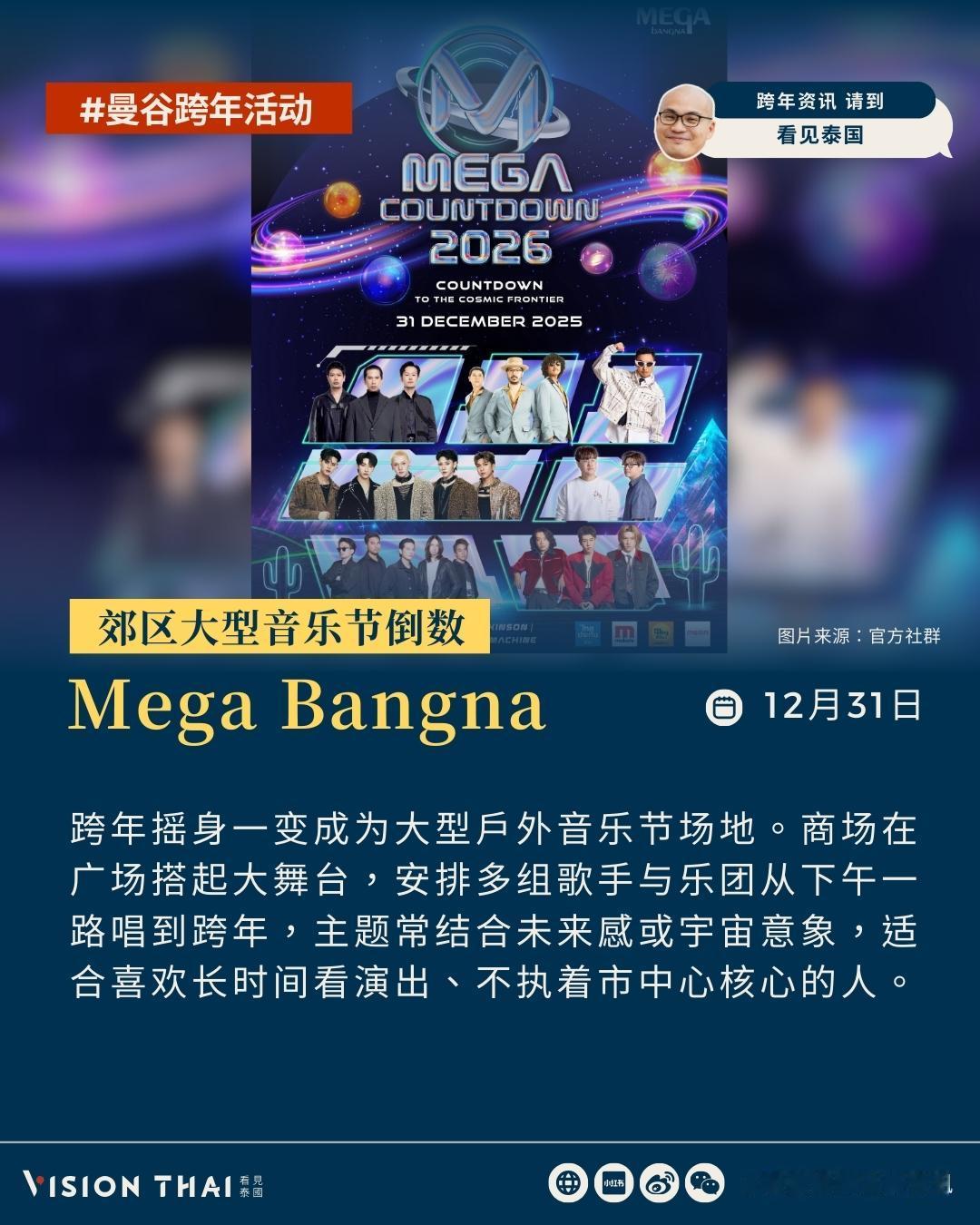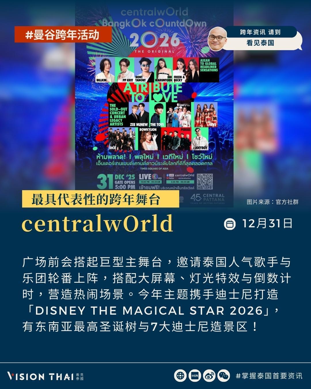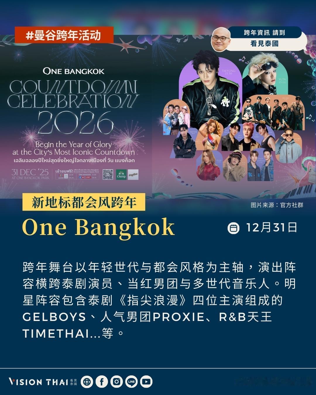 【2026曼谷跨年怎么玩?GOT7段宜恩、LING-ORM、李海海…等泰星陪你倒数迎烟火】 CentralwOrld:最具代表性的跨年舞台 centralwOrld长年被视为曼谷跨年的指标舞台,广场前会搭起巨型主舞台,邀请泰国人气歌手与乐团轮番上阵,搭配大屏幕、灯光特效与倒数计时,营造热闹场景。今年主题携手迪士尼打造「Disney The Magical Star 2026」,有东南亚最高约35米圣诞树与7大迪士尼造景区,让你白天沉浸在迪士尼童话场景拍照购物,晚上参加广场跨年倒数与烟火。 今年centralwOrld 的跨年晚会卡司阵容坚强,邀来以《以你的心诠释我的爱》走红的Billkin & PP Krit、《天生一对 2》主题曲演唱者 Ink Waruntorn、泰国流行男歌手Nont Tanont、创作女歌手 Bowkylion、当红音乐才子The Toys、饶舌歌手Joey Boy,以及人气女团4EVE、男团PERSES、DICE。 此外,还邀请《指尖浪漫》4 位主演组成的 GELBOYS、同性题材高人气演员Zee与 NuNew,以及《粉红理论》超热门CP Becky & Freen 同台演出,陪粉丝迎接崭新一年。 One Bangkok:新地标都会风跨年 作为近年备受瞩目的大型复合开发案,壹曼谷One Bangkok以现代建筑与开放空间吸引目光。跨年舞台以年轻世代与都会风格为主轴,演出阵容横跨泰剧演员、当红男团与多世代音乐人。 明星阵容包含泰剧《指尖浪漫》四位主演组成的GelBoys、人气男团PROXIE、R&B天王Timethai、性感女歌手KT Kratae,以及资深歌手J Jetrin携明星儿子贾卡帕特(Jao Khun)、《天才枪手》主演Jao Naay及Jao Samut同台。音乐才子Pun与BL剧《恋恋不懂》主演蔡有福、坎塔蓬也将现身。 Mega Bangna:郊区大型音乐节倒数 Mega Bangna位于曼谷郊区,每年跨年摇身一变成为大型户外音乐节场地。商场在广场搭起大舞台,安排多组歌手与乐团从下午一路唱到跨年,主题常结合未来感或宇宙意象,适合喜欢长时间看演出、不执着市中心核心的人。 演出阵容包含五人男团PERSES、灵魂复古乐团THE PARKINSON、人气乐团TILLY BIRDS、摇滚指标SLOT MACHINE(拉霸乐团)、乐团FLURE,以及嘻哈代表人物JOEY BOY,完整呈现音乐节式的跨年体验。 暹罗天地ICONSIAM:商场活动+河畔烟火双重体验 12月27日|人气女团PiXXiE、4EVE、唱跳男团ATLAS、DMD BOYS及XEBIS Entertainment旗下艺人登场。 12月28日|饶舌歌手URBOYTJ、CDGUNTEE、新生代女演员NARA、男团CIR*CRL及知名DJ Paul Sirisant,整体风格偏向音乐节与派对氛围。 12月29日|摇滚天团SLOT MACHINE(拉霸乐团)领衔,搭配大热乐团Three Man Down、新生代男团Y2Z、IAM旗下艺人及WAYDAY接力登台。 12月30日|GL剧《我们的秘密》邝玲玲与可恩娜帕、BL剧《荆棘的天堂》哈里特、《灵魂重生》纳帕沙功,以及歌手Prim、双胞胎女子组合Angel Angie、DRIPA、选秀限定男团LAZ1登台。 12月31日|真正的高潮落在12月31日跨年夜,由GOT7成员、台裔美籍饶舌歌手段宜恩(Mark Tuan)担任国际级焦点嘉宾。BL剧人气演员方面,包括知名歌手、《黑帮少爷爱上你》主演罗杰夫(Jeff Satur)、《缘来誓你》男主李海海(Zee Pruk Panich)、《甜心派》主演林景云现身舞台。 音乐阵容同样重量级,由泰国国民级乐团Bodyslam压轴演出,并集结男团BUS(Because of You I Shine)、PROXIE,以及Domundi旗下首支男团DEXX,在昭披耶河畔烟火中完成年度最盛大的跨年倒数。 河畔的玩法可以弹性搭配,有人选择在ICONSIAM河岸卡位,有人提早预订河景餐厅或酒店rooftop一边享用跨年晚餐、一边迎接倒数;也有人报名跨年夜游船,让船在倒数前后驶到视野佳的位置观赏烟火。 曼谷寺庙祈福跨年:庄严仪式感 除了烟火和舞台,泰国是佛教国家,泰国人迎接新年的方式也包含到寺庙祈福。在12月31日晚间到1月1日清晨在寺庙渡过,以礼佛、诵经、布施等方式做功德,为新的一年祈求平安顺利。 原文:-hans/article/bangkok-countdown-2026/ 看更多:-hans/