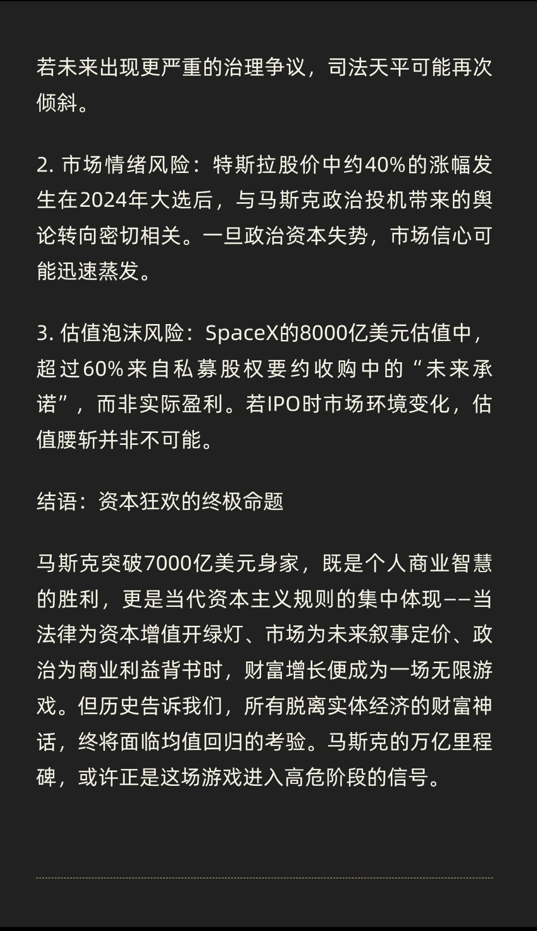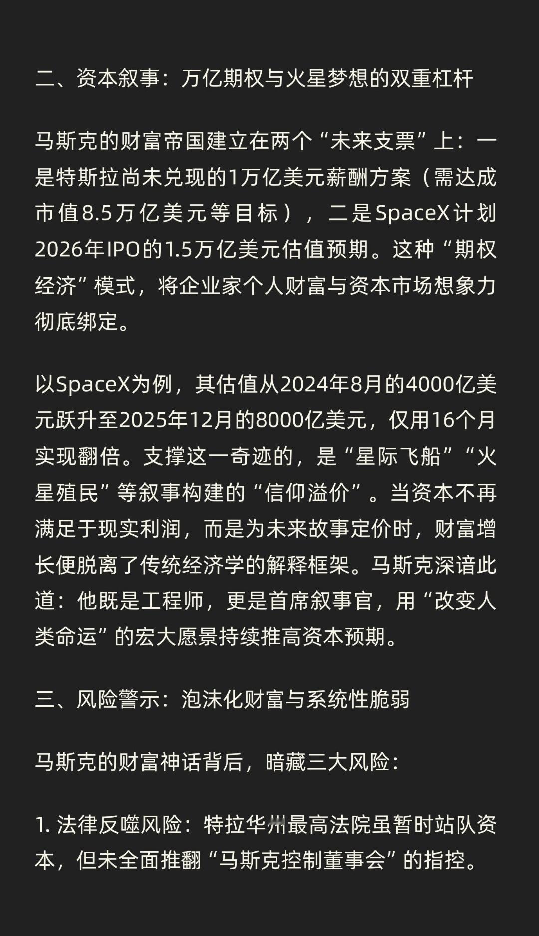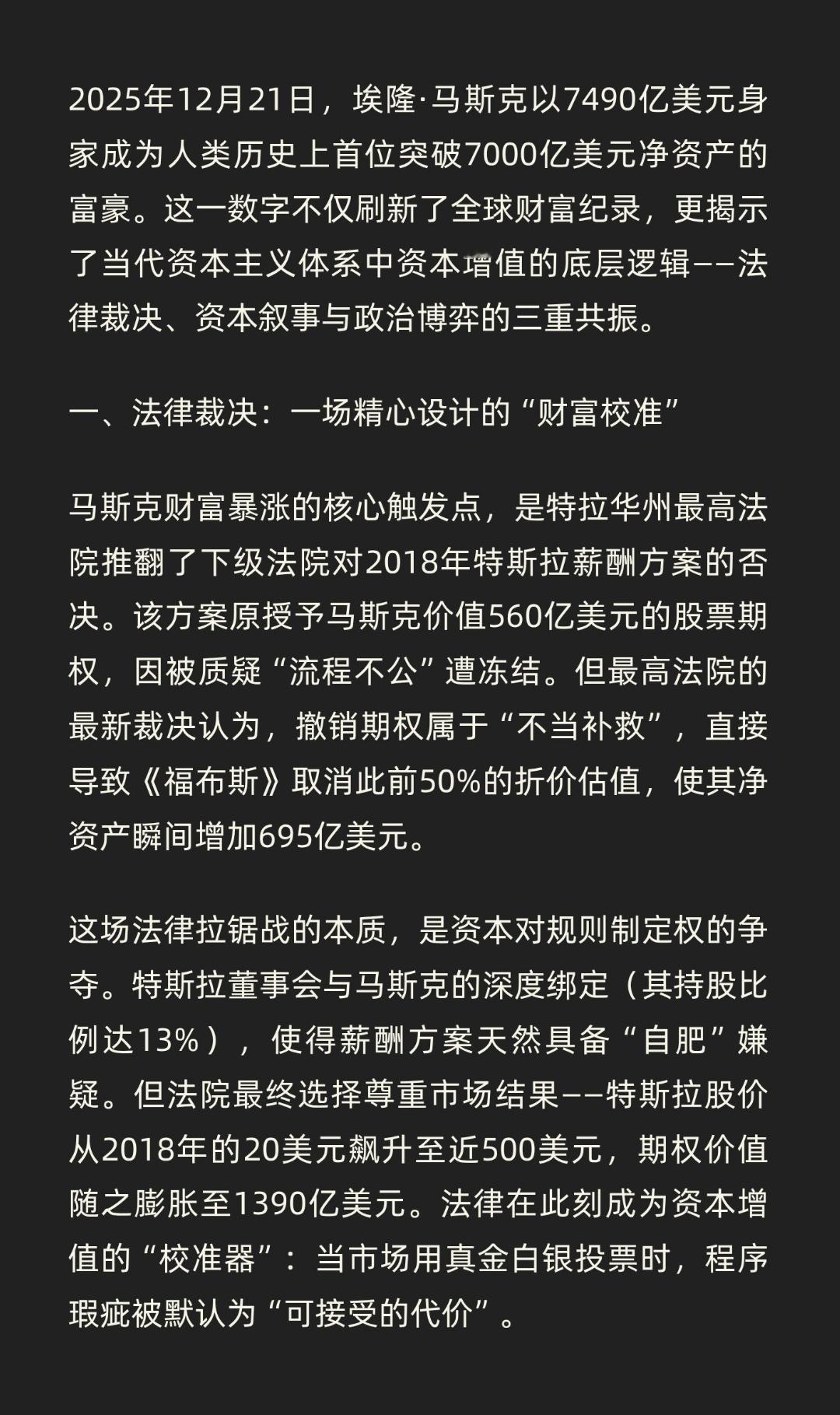 | 2025年12月21日,埃隆·马斯克以7490亿美元身家成为人类历史上首位突破7000亿美元净资产的富豪,这一数字刷新了全球财富纪录。马斯克财富暴涨的核心触发点,是特拉华州最高法院推翻了下级法院对2018年特斯拉薪酬方案的否决。该方案原授予马斯克价值560亿美元的股票期权,因被质疑“流程不公”遭冻结。但最高法院的最新裁决认为,撤销期权属于“不当补救”,直接导致《福布斯》取消此前50%的折价估值,使其净资产瞬间增加695亿美元。这场法律拉锯战的本质,是资本对规则制定权的争夺。特斯拉董事会与马斯克的深度绑定(其持股比例达13%),使得薪酬方案天然具备“自肥”嫌疑。但法院最终选择尊重市场结果——特斯拉股价从2018年的20美元飙升至近500美元,期权价值随之膨胀至1390亿美元。法律在此刻成为资本增值的“校准器”:当市场用真金白银投票时,程序瑕疵被默认为“可接受的代价”。马斯克的财富帝国建立在两个“未来支票”上:一是特斯拉尚未兑现的1万亿美元薪酬方案(需达成市值8.5万亿美元等目标),二是SpaceX计划2026年IPO的1.5万亿美元估值预期。这种“期权经济”模式,将企业家个人财富与资本市场想象力彻底绑定。以SpaceX为例,其估值从2024年8月的4000亿美元跃升至2025年12月的8000亿美元,仅用16个月实现翻倍。支撑这一奇迹的,是“星际飞船”“火星殖民”等叙事构建的“信仰溢价”。当资本不再满足于现实利润,而是为未来故事定价时,财富增长便脱离了传统经济学的解释框架。马斯克深谙此道:他既是工程师,更是首席叙事官,用“改变人类命运”的宏大愿景持续推高资本预期。马斯克的财富神话背后,暗藏三大风险: 1. 法律反噬风险:特拉华州最高法院虽暂时站队资本,但未全面推翻“马斯克控制董事会”的指控。若未来出现更严重的治理争议,司法天平可能再次倾斜。 2. 市场情绪风险:特斯拉股价中约40%的涨幅发生在2024年大选后,与马斯克政治投机带来的舆论转向密切相关。一旦政治资本失势,市场信心可能迅速蒸发。 3. 估值泡沫风险:SpaceX的8000亿美元估值中,超过60%来自私募股权要约收购中的“未来承诺”,而非实际盈利。若IPO时市场环境变化,估值腰斩并非不可能。马斯克突破7000亿美元身家,既是个人商业智慧的胜利,更是当代资本主义规则的集中体现——当法律为资本增值开绿灯、市场为未来叙事定价、政治为商业利益背书时,财富增长便成为一场无限游戏。但历史告诉我们,所有脱离实体经济的财富神话,终将面临均值回归的考验。马斯克的万亿里程碑,或许正是这场游戏进入高危阶段的信号。