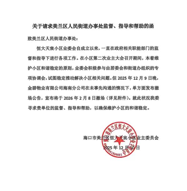 活久见!金碧物业自炒“鱿鱼”不干了,看来躺赚的日子要过去了。 最近服务海口美丽沙天宸小区的金碧物业,在小区业主们投票中止金碧物业服务后,没有回头和拖延,硬气的发出了物业公司撤场公告。金碧物业自炒“鱿鱼”,在新物业未定的情况下,主动提出离场,自己把自己给炒了。 12月9日,金碧物业正式发布通知,将于2026年2月8日退出海口美丽沙天宸小区的物业服务工作。 业委会随后发函指责金碧物业在未经沟通的情况下单方面退场。这个就有点酸了,纠纷矛盾不是一天两天了,你都不让人家干了,人家还不能撤么。我就不信在赶走旧物业之前,业委会就没有提前做好一个旧物业撒场后的预案吗。 金碧物业在美丽沙服务管理恒大开发的12个小区,长期以来高达3.8元的物业费深受业主诟病。和天宸小区的纠纷,只是金碧服务恒大美丽沙片区纷争中的一个缩影。 今年以来,重庆、广东三明、湖南岳阳等地纷纷传来金碧物业主动撤场的消息,如今看来要加上海南了。