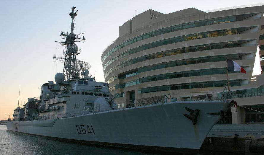 法国“乔治·莱格”级驱逐舰“乔治·莱格”级驱逐舰是法国于20世纪70年代建造的反潜型驱逐舰,又称为F70型驱逐舰,一共建造了7艘,截至2016年6月仍有5艘在役。“乔治·莱格”级驱逐舰以反潜、舰队护航、水面作战为主要任务,可配合法国的航空母舰战斗群执行作战任务或在弹道导弹核潜艇进出港时提供护卫,并具备基本的防空自卫能力。武器装备:1座八联装“响尾蛇”舰空导弹发射装置、1座双联装“西北风”近程防空导弹系统、2座四联装MM 40“飞鱼”反舰导弹发射装置、1门100毫米全自动炮、2门20毫米厄利空单管炮。动力装置:2具奥林巴斯TM3B燃气轮机、2具皮尔斯蒂克16PA6 V280柴油发动机。为了取代20世纪50年代服役的T47型驱逐舰,法国海军在20世纪70年代开始规划建造一批新的通用驱逐舰,称为“乔治·莱格”级。1971年,“乔治·莱格”级驱逐舰的草图完成,1972年进入设计阶段。1974年9月,首舰“乔治·莱格”号开工,1978年11月下水,1979年12月服役。该级舰共建造了7艘,截至2016年仍有5艘在役。值得一提的是,法国海军内部并没有“驱逐舰”的舰艇分类,所有水面作战舰艇皆称为“护卫舰”,“乔治·莱格”级被法国列为一等护卫舰,等同于其他国家的驱逐舰,并使用D作为舷号开头。“乔治·莱格”级驱逐舰为长艏楼的双桨、一舵驱逐舰,后舰体水线面丰满,有利于提高舰的适航性。采用方尾,尾板在水线之上,尾端没有浸水,减少了舰的湿表面积,有利于减小低速时的阻力。艏部干舷相对较低,因为露天甲板首部有负5度的倾斜。“乔治·莱格”级驱逐舰仅具备点防空能力,由1座八联装“响尾蛇”舰空导弹发射装置承担,后三艘舰对其进行了改进,使其具备了反导能力,并加装了1座双联装“西北风”近程防空导弹系统。反舰武器为4座单装MM 38“飞鱼”反舰导弹发射装置,后五艘改为2座四联装MM 40型。此外,还装有1门100毫米全自动炮和2门20毫米厄利空单管炮。远程反潜任务主要由2架舰载“山猫”直升机承担。|