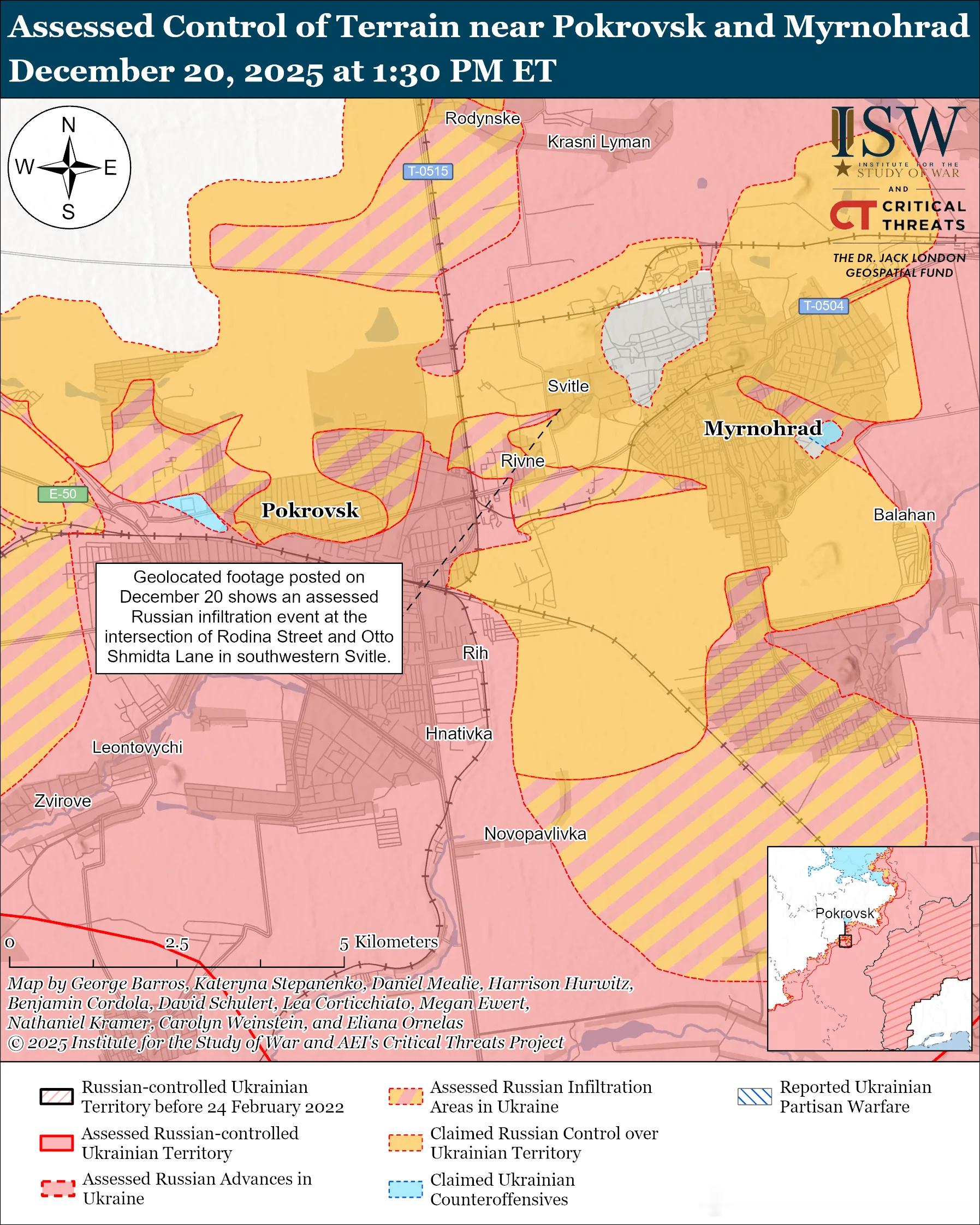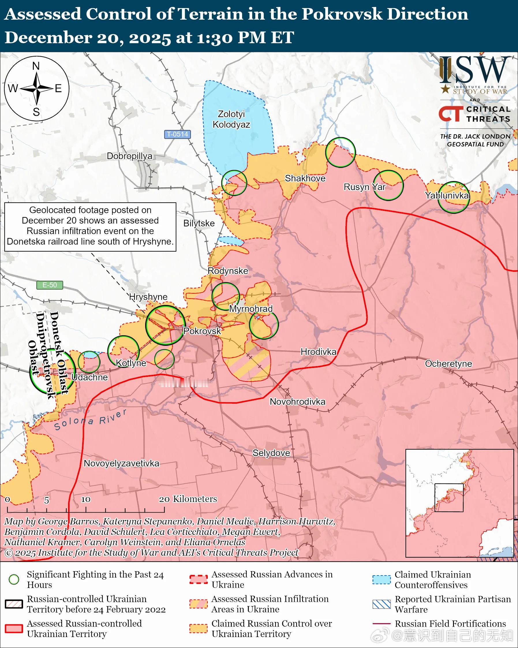 俄军主要行动3俄军目标:占领顿涅茨克州全境,并向第聂伯罗彼得罗夫斯克州推进。12月20日俄军继续向锡维尔斯克方向发起进攻,但并未取得确切进展。未经证实的说法:一位俄罗斯军事博主声称,俄军推进到库兹米尼夫卡(锡韦尔斯克以南)和邦达尔内附近,以及赫罗米夫卡(均位于锡韦尔斯克西南)的东郊。12 月 19 日至 20 日,俄军在锡韦尔斯克附近、锡韦尔斯克西北部的德罗尼夫卡和普拉托尼夫卡附近、锡韦尔斯克东北部的谢列布里扬卡附近、锡韦尔斯克东南部的维姆卡附近以及锡韦尔斯克西南部瓦休基夫卡附近发动了进攻。乌克兰第七军于12月20日报告称,俄军正在利用谢列布里扬斯克森林地区集结兵力,建立无人机操作员的前沿阵地,并向谢列布里扬卡和德罗尼夫卡方向发起进攻。此前ISW曾评估认为,俄军的光纤无人机创新技术解决了普通无人机无线电信号被树叶遮挡的问题,使俄军最终得以在谢列布里扬斯克森林地区集结兵力并更积极地利用该地区。第七军报告称,乌克兰军队仍在德罗尼夫卡坚守阵地,并击退了俄军渗透德罗尼夫卡的企图。该军报告称,俄军主要以小队形式行动,身穿吉利服和保暖斗篷进行伪装,以识别乌克兰阵地的薄弱环节。该军指出,俄军在该地区的主要目标是渗透扎基特内(位于锡韦尔斯克西北部),并在制高点巩固阵地。 12 月 19 日在锡韦尔斯克方向作战的乌克兰旅发言人报告称,俄罗斯无人机操作员在锡韦尔斯克的多层建筑物内建立了阵地,使俄军能够对锡韦尔斯克进行火力控制,并破坏该地区乌克兰的后勤和防线。12月20日俄军继续在科斯蒂安蒂尼夫卡-德鲁日基夫卡战术区发动进攻行动,但并未取得确切进展。未经证实的说法:一位俄罗斯军事博主声称,俄军占领了位于科斯佳蒂尼夫卡南部的科斯佳蒂尼夫卡火车站。俄军攻击了科斯特扬尼夫卡及其附近地区; Kostyantynivka以东,靠近Stupochky和Predtechyne;位于 Kostyantynivka 东南部,靠近 Pleshchiivka、Kleban-Byk、Oleksandro-Shultyne 和 Ivanopillya; Kostyantynivka 西南部,靠近 Yablunivka; Druzhkivka以南,靠近Rusyn Yar;从 Druzhkivka 西南部前往 Sofiivka 和 Novopavlivka。 12月20日在科斯蒂安蒂尼夫卡方向作战的乌克兰旅发言人报告称,俄军改变了战术,从三到五人一组的突击行动改为派出单个步兵进行突击。该发言人报告称,俄军在下雪、下雨和大雾天气中行进和进攻,以避免被发现,同时侦察乌克兰阵地,以便进行打击。乌克兰国家紧急服务部门于 12 月 19 日发布了带有地理位置信息的视频,显示俄罗斯无人机操作员对正在扑灭德鲁日基夫卡一家加油站火灾的乌克兰消防员进行了双重打击,该火灾是由俄罗斯此前的一次袭击造成的。作战序列:据报道车臣第78塞韦尔-阿赫马特摩托化步兵团(第42摩步师,第58合成集团军,南部军区)和第1194摩步团(第4摩步旅,第3合成集团军,南部军区)的无人机操作员和其他部队正在科斯蒂安蒂尼夫卡附近作战。第103摩步团(第150摩步师,第8合成集团军,南部军区)的无人机操作员正在打击别列斯托克(科斯蒂安蒂尼夫卡以南)和克列班-比克附近的乌克兰阵地。第 58 独立特种部队营(非正式名称为“猎人”特种部队分遣队)(第 51 集团军,特种作战司令部)的 (FPV) 无人机操作员正在科斯蒂安蒂尼夫卡方向打击乌克兰阵地。第 242 摩步团(第 20 摩步师,第 8 集团军)的无人机操作员正在鲁辛亚尔附近打击乌克兰部队。12月20日俄军继续在多布罗皮利亚战术区开展进攻行动,但并未取得确切进展。未经证实的说法:一位俄罗斯军事博主声称,俄军在诺韦沙霍韦(多布罗皮利亚以东)附近以及博伊基夫卡、扎波维德内和多罗日涅(均位于多布罗皮利亚东南)推进。12月19日和20日,俄军在多布罗皮利亚以东的沙霍韦和新沙霍韦附近发动进攻。12 月 20 日一位俄罗斯军事博主声称,俄军占领了新沙霍韦附近通往佐洛蒂科洛迪亚兹(多布罗皮利亚东北部)的一段道路。战斗序列:据报道俄第 33 摩步团(第 20 摩步师,第 8 集团军)和第 174 独立侦察营(第 150 摩步师,第 8 集团军)正在多布罗皮利亚方向作战。乌克兰军队最近在波克罗夫斯克方向推进并维持了阵地。经评估俄军渗透行动:12月20日公布的地理定位视频显示,两名俄罗斯军人在斯维特莱西南部(波克罗夫斯克东北部)升起了俄罗斯国旗。12月20日公布的另一段地理定位视频显示,乌克兰军队在格赖申以南(波克罗夫斯克西北部)的顿涅茨克铁路沿线袭击了俄罗斯军人。ISW评估认为,这些是俄军的渗透行动。未经证实的说法:俄罗斯国防部声称俄军占领了斯维特列。俄罗斯军事博客作者声称俄军在米尔诺赫拉德北部(波克罗夫斯克以东)推进。一位俄罗斯军事博客作者声称俄军占领了米尔诺赫拉德。其他俄罗斯军事博客作者批评占领米尔诺赫拉德的说法为时尚早,指出俄军只占领了该镇的一半,乌克兰军队仍然在北部地区驻扎。俄罗斯声称占领的区域范围:12 月 20 日发布的地理定位视频显示,俄军使用多管火箭炮系统 (MLRS) 对乌克兰占领的米尔诺赫拉德北部的一栋建筑物进行了打击——此前俄方声称,俄军在该地区保持着存在。12月19日和20日,俄军在波克罗夫斯克附近及城内发动进攻;在波克罗夫斯克北部的罗丁斯克附近;在波克罗夫斯克东北部的斯维特列附近;在波克罗夫斯克东部的米尔诺赫拉德附近;在波克罗夫斯克西南部兹维罗韦、科特利涅、乌达奇涅、莫洛杰茨克和