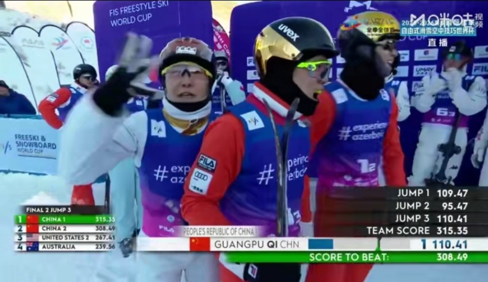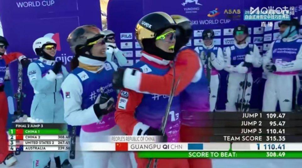 这是高光时刻!徐梦桃、齐广璞、李天马组成的中国一队以315.35分夺混团金牌,中国二队拿银牌,男女单+团体中国队包揽三冠 !徐梦桃赛后说,终于弥补了北京冬奥混团摘银的遗憾。