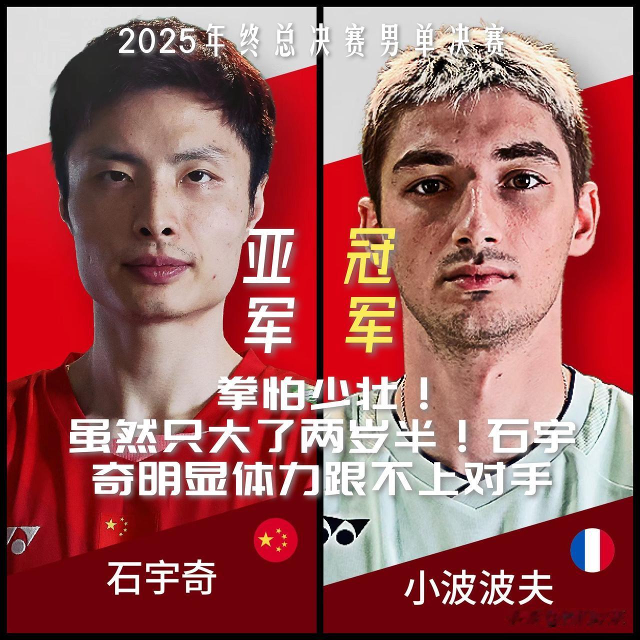 【拳怕少壮!石宇奇明显体力跟不上小波波夫卫冕失利!】 2025世界羽联年终总决赛男单决赛,中国球员石宇奇以19-21、9-21不敌法国球员小波波夫斩获亚军。 虽然年龄只大了两岁半,但石宇奇体力明显体力跟不上小波波夫,疲于应付。 尤其第二局非常被动! 本届赛事,小波波夫发挥出色,以全胜战绩夺冠!